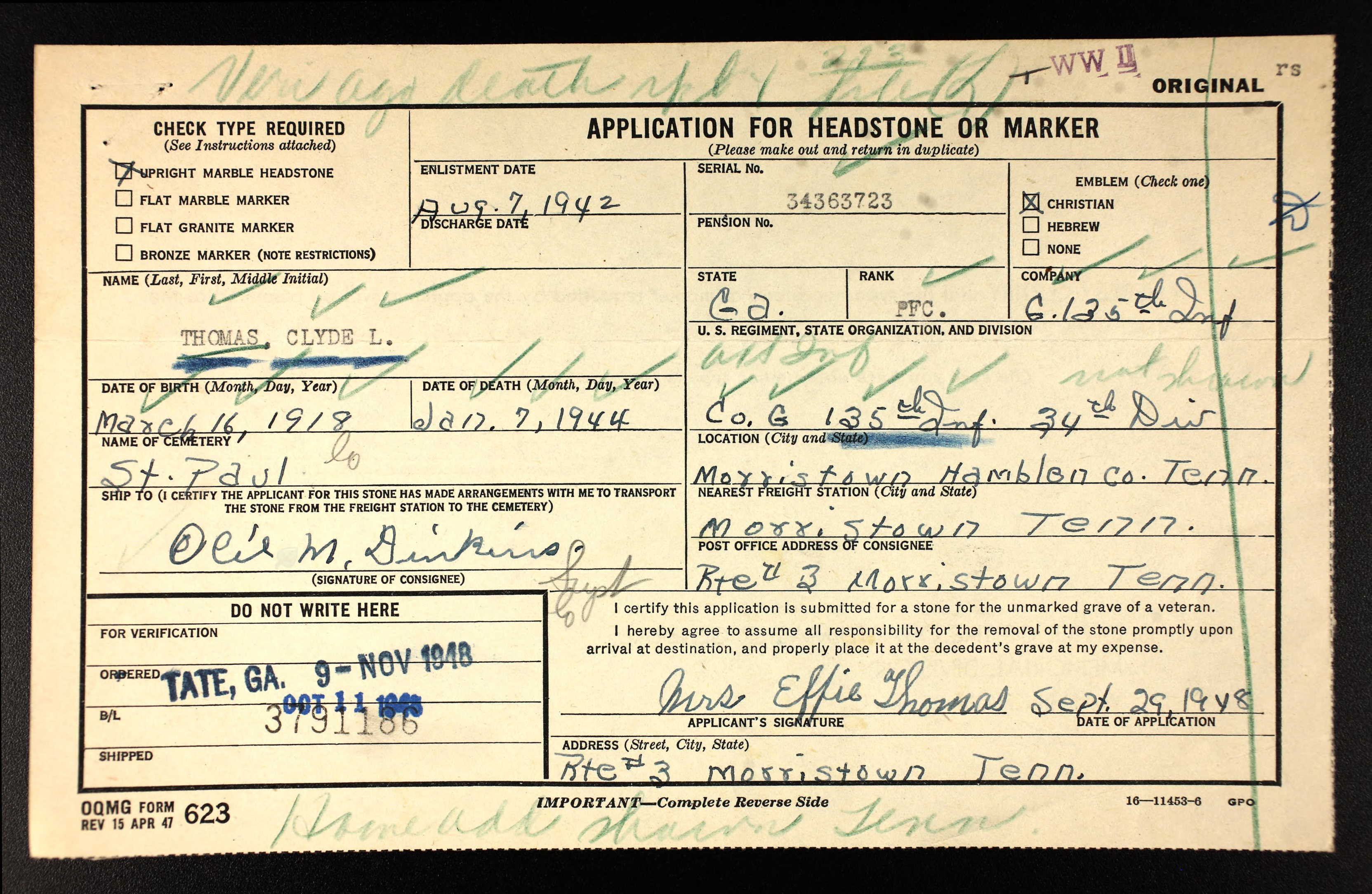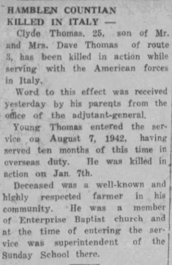 Pvt. Thomas was killed in action in Italy on August 1942 after serving ten months overseas. He was well known and a valued member of Enterprise Baptist church of which he was serving as Sunday School Superintendent at the time of entering the service.