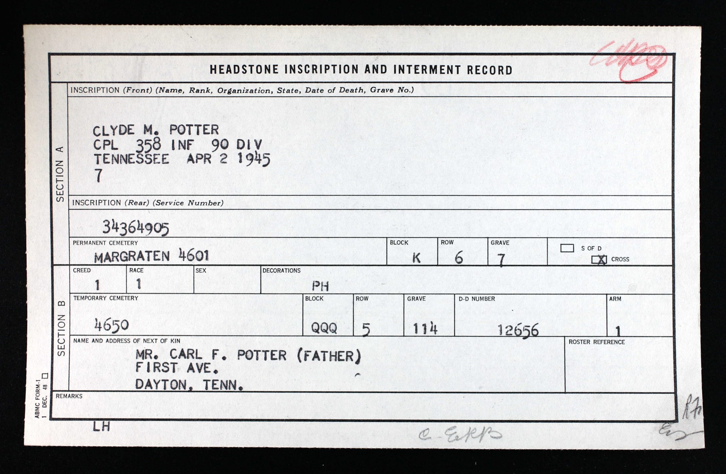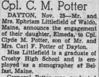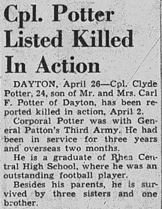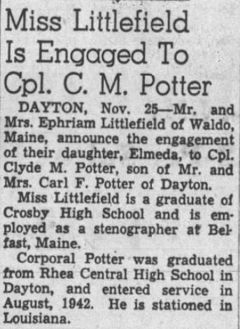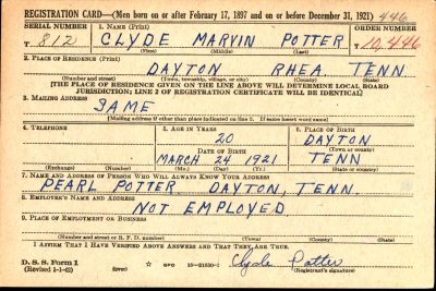 Clyde Marvin Potter was born in Dayton, TN. He was the son of Carl Franklin Potter and Pearl Jane Austin. He was engaged with Elmeda Littlefield in November, 1944