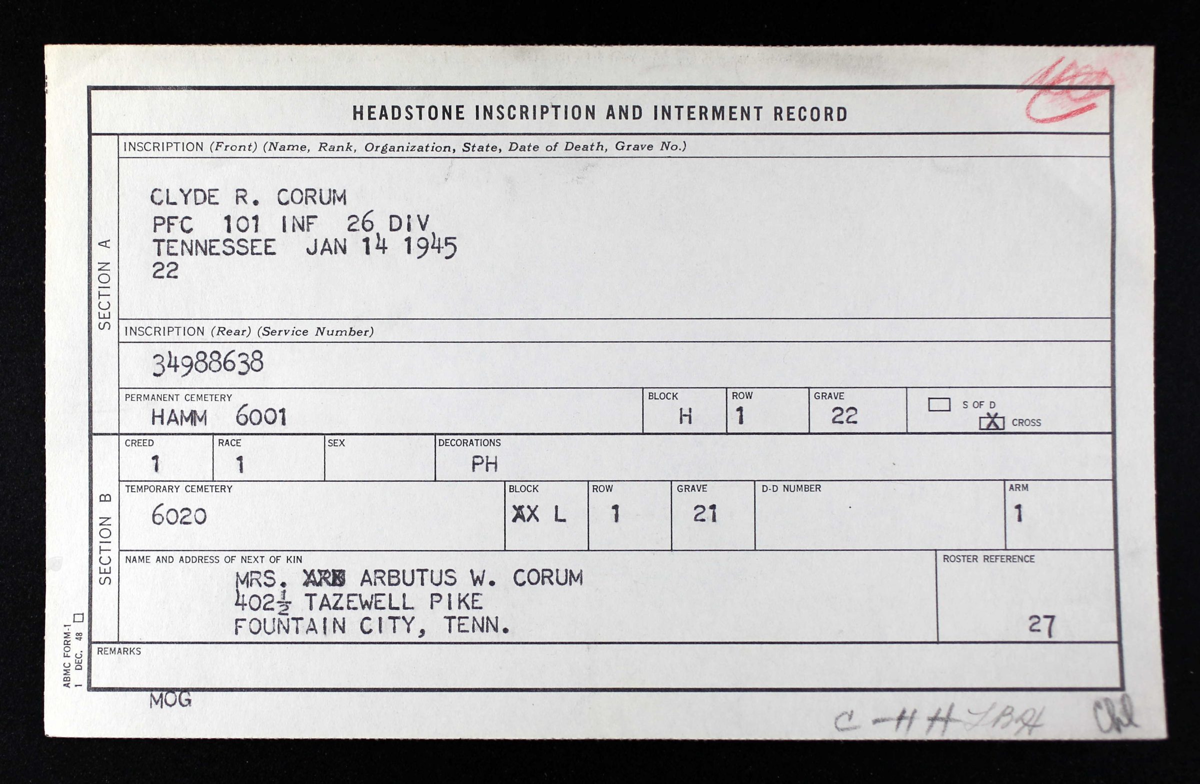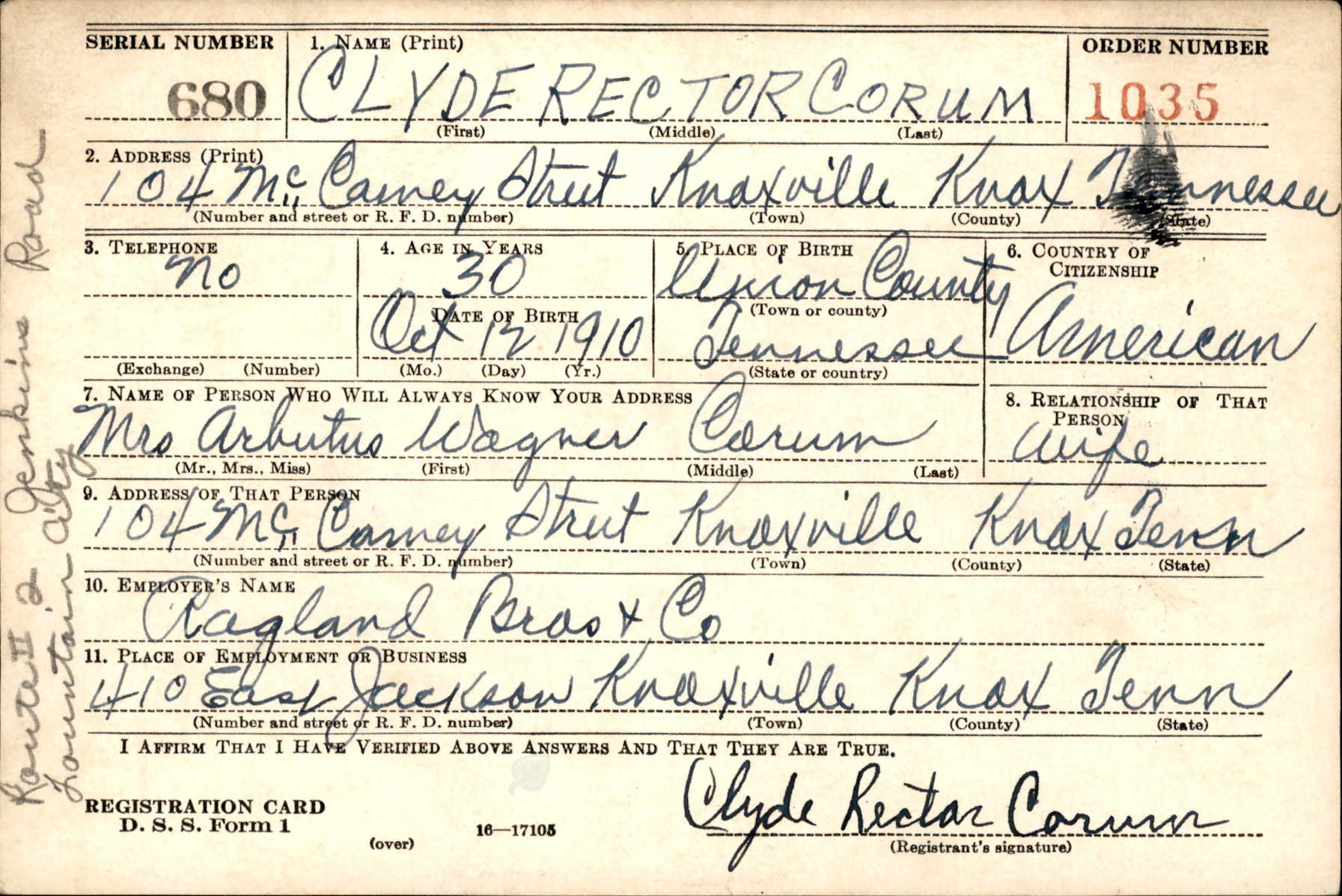 Clyde Rector Corum was born in Union County, Tennessee, the son of Jerry Thomas Corum and Sarah Lillie Wallace. He was married to Arbutus Manta Waggoner.