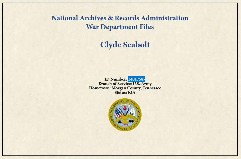 He was KIA in France (WWII Gov. Archives and family records provided by his sister/my grandmother Sally Northrup). He is buried in Sunbright Cemetery.