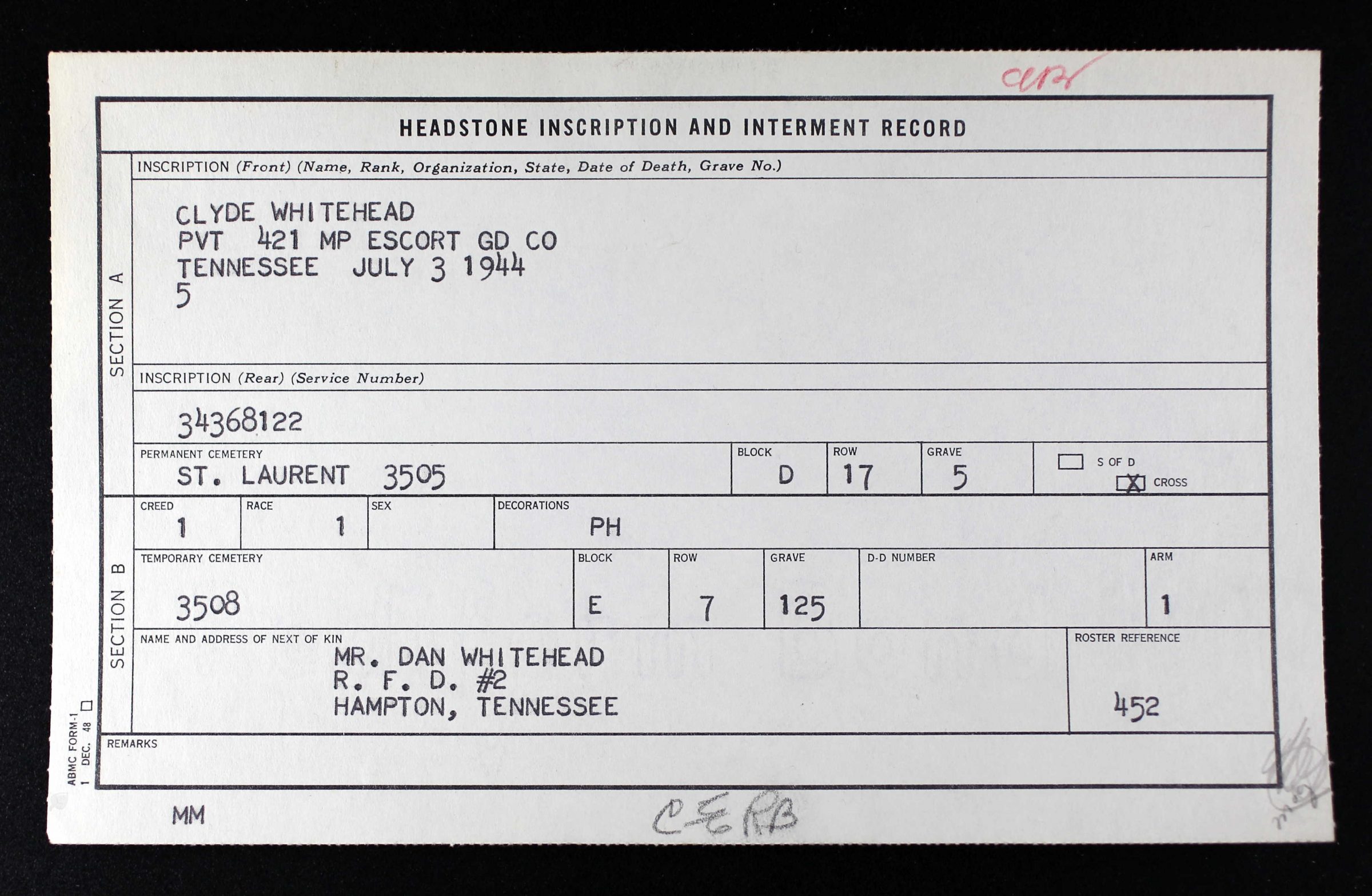 He was initially buried at Blosville Cemetery at Carentan, France and reburied at Normandy American Cemetery, Colleville-sur-Mer, France, D, 17, 5.