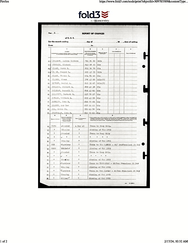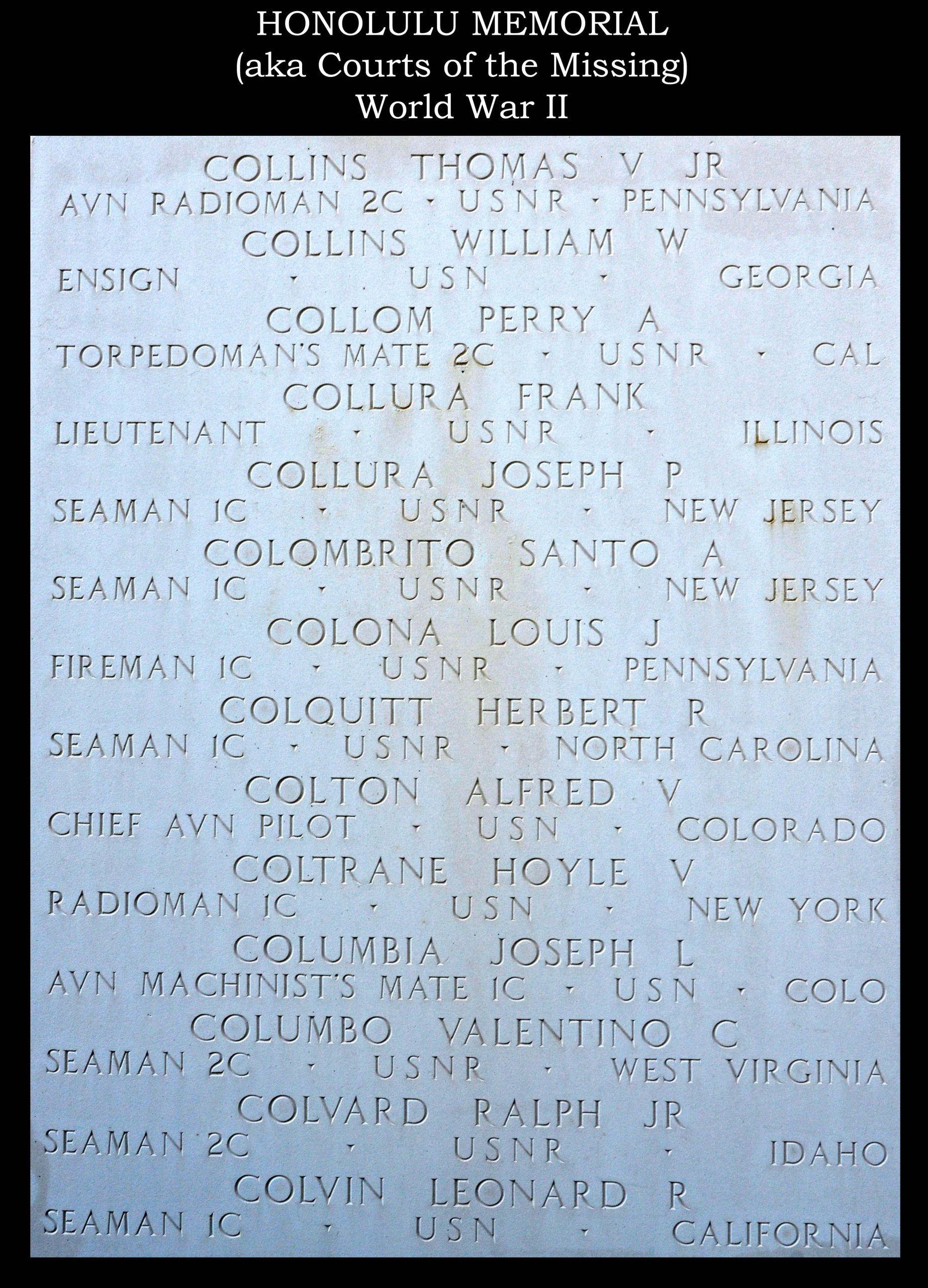 - Burial/Memorial Location: Honolulu National Memorial Cemetery of the Pacific Courts of the Missing