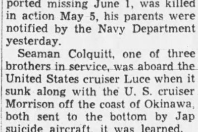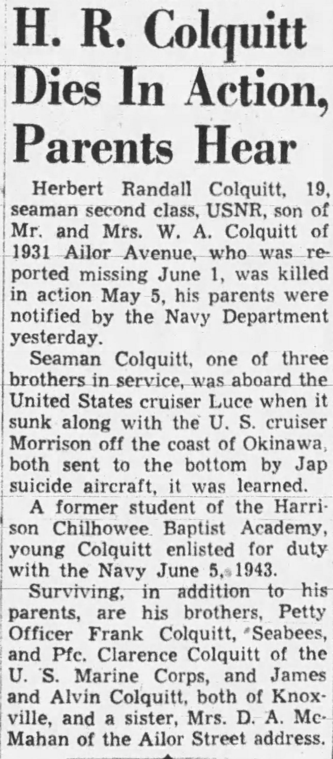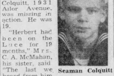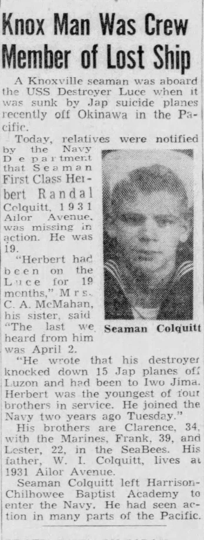 Seaman First Class Herbert Randall Colquitt, son of W.A. Colquitt, 1931 Ailor Avenue, who had previously been reported missing since the sinking of the USS Luce off Okinawa, was killed in action May 4, his family has been notified.