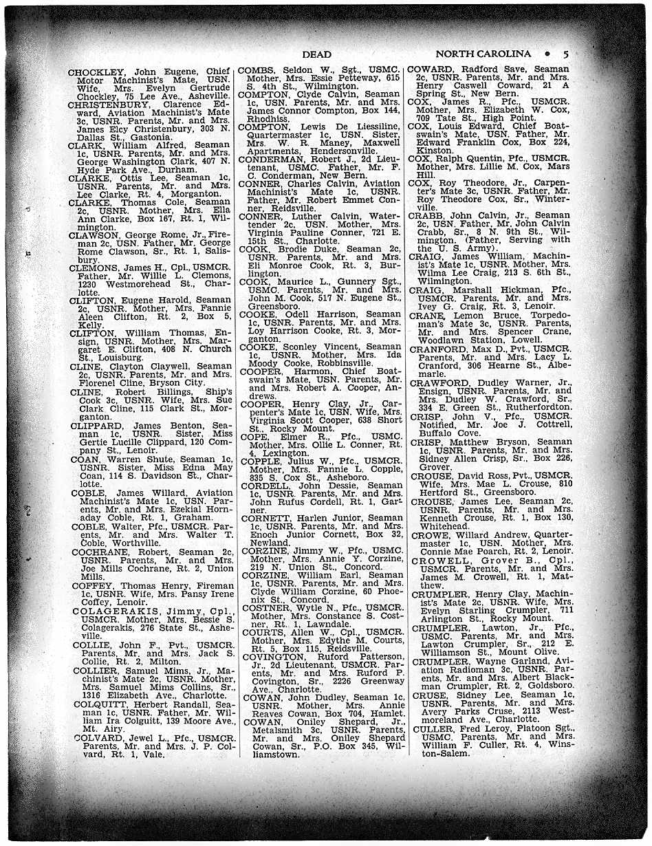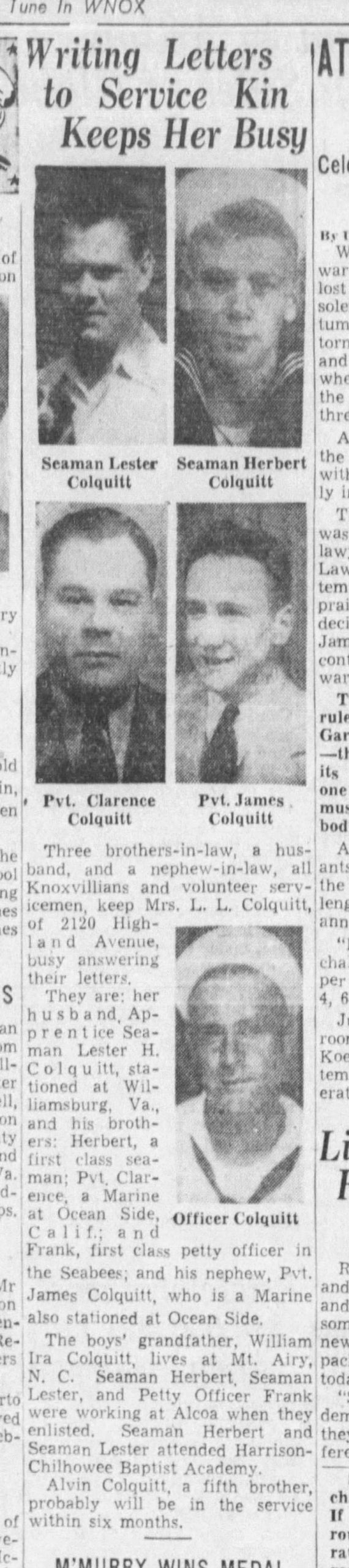 Besides his father, he is survived by three brothers in service, Marine Pfc. Clarence Colquitt, on Okinawa; PO Third Class Lester Colquitt, also on Okinawa, and PO First Class, Frank Colquitt, on Iwo Jima; two brothers at home, James and Alvin; and one sister, Mrs. C.A. McMahan.