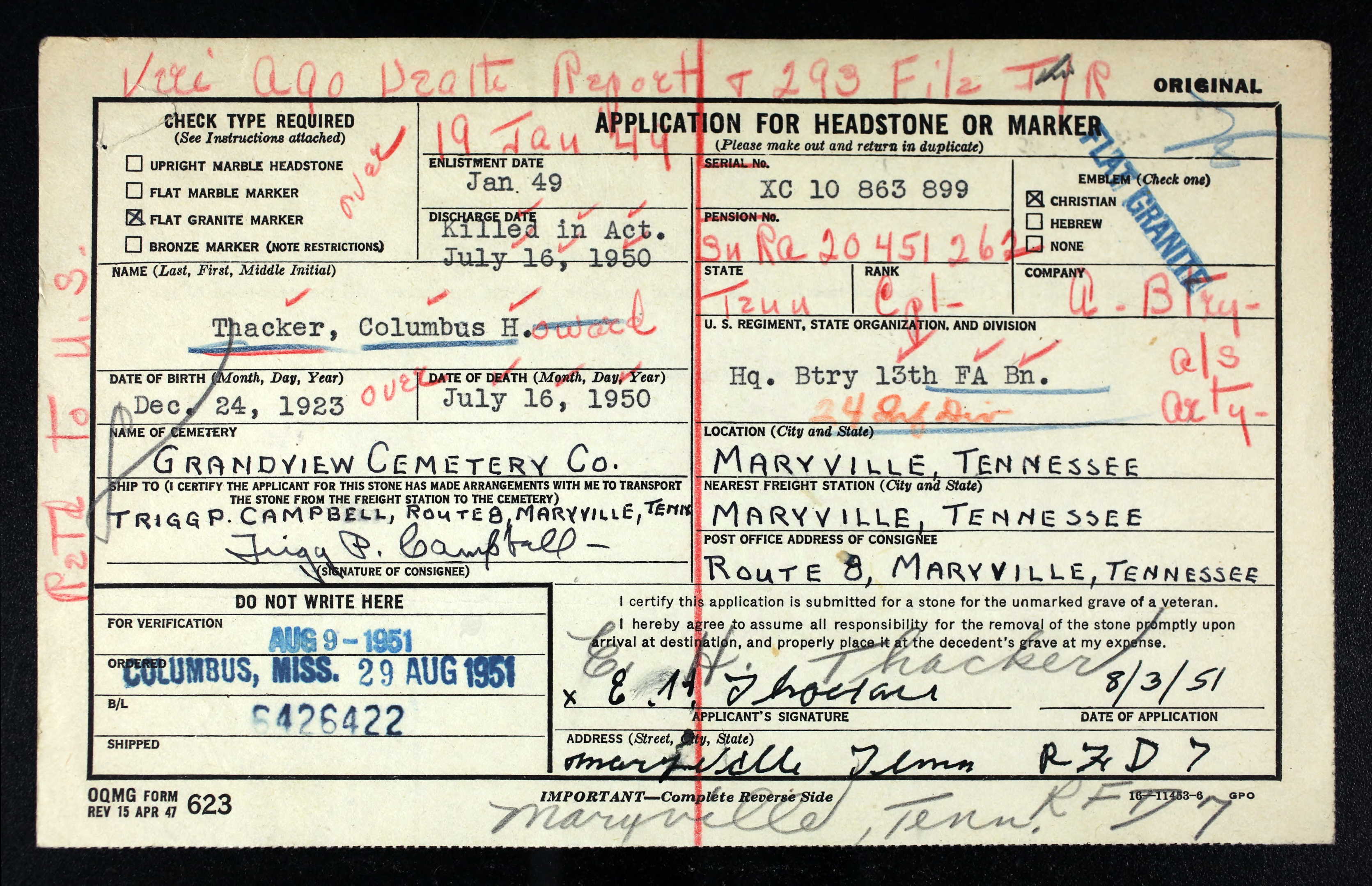 Corporal Thacker was a member of the 13th Field Artillery Battalion, 24th Infantry Division. He was Killed in Action while fighting the enemy in South Korea on July 16, 1950.