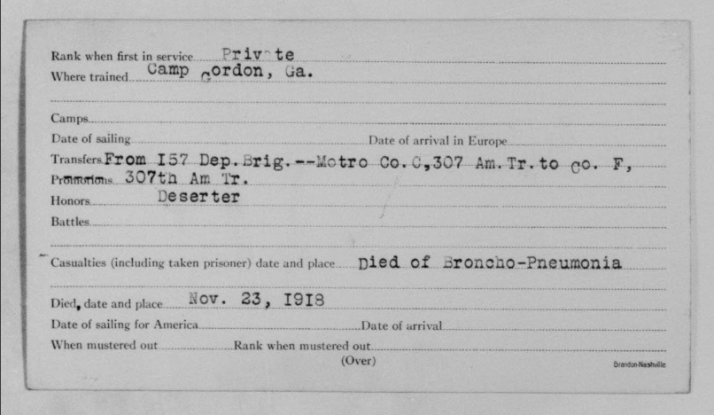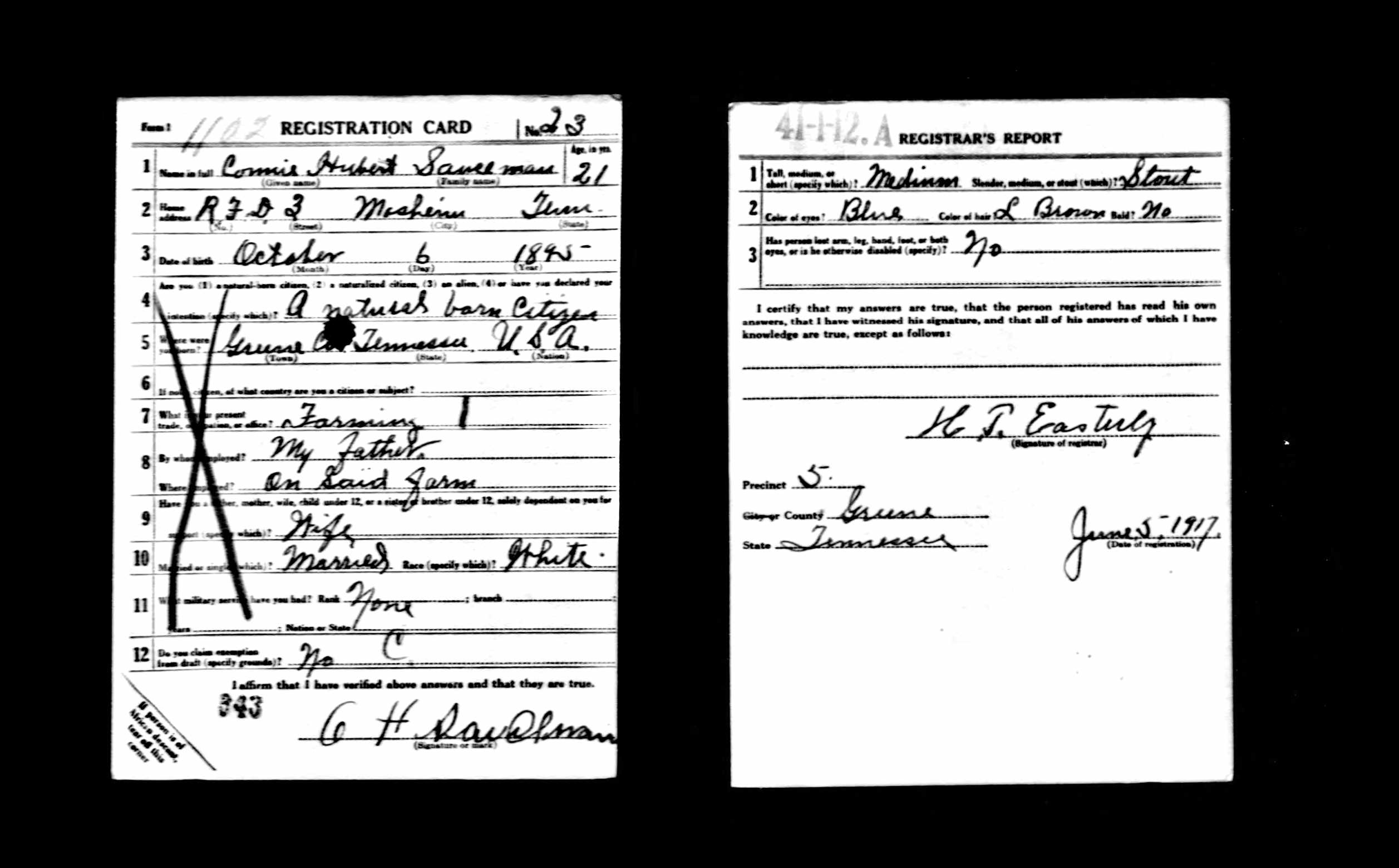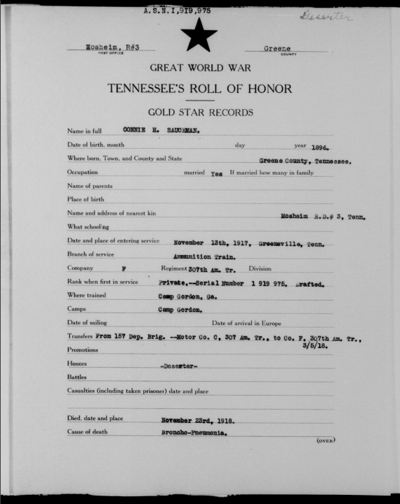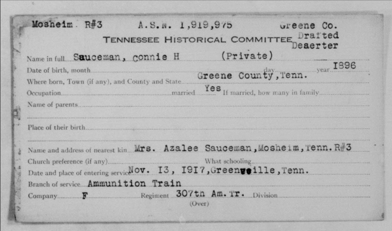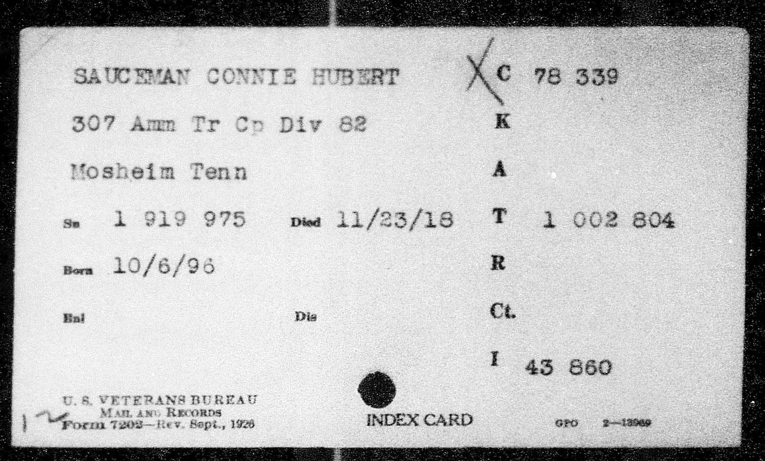 Connie Hubert Sauceman was the son of James Alvin Sauceman and Azalee Gregg. He died of broncho-pneumonia on 23 November 1918. Pvt Sauceman is buried at Pine Grove UMC Cemetery, Greeneville, Greene County, Tennessee.