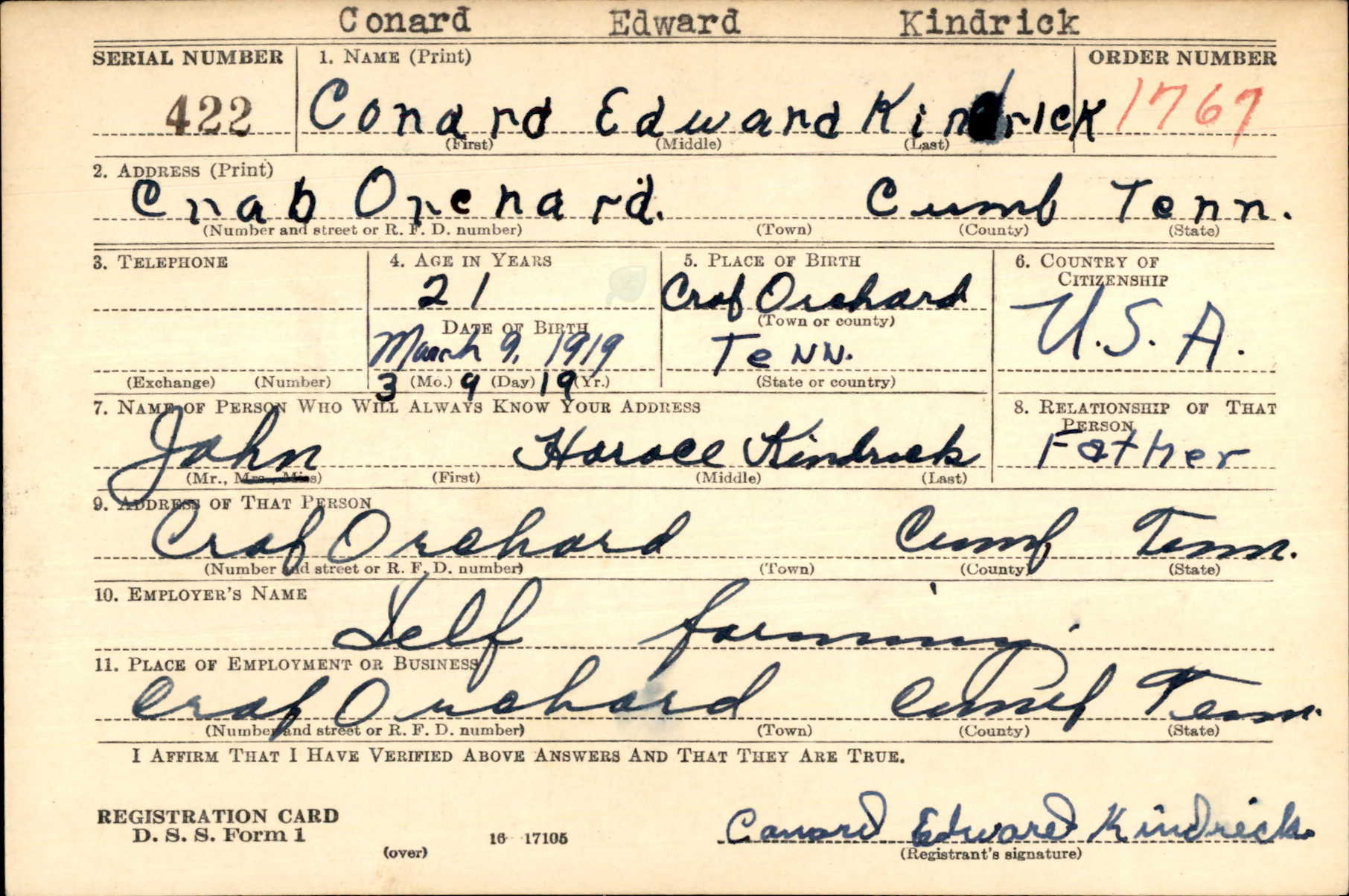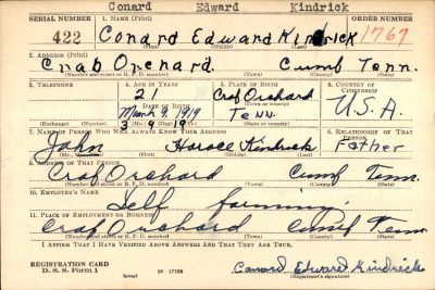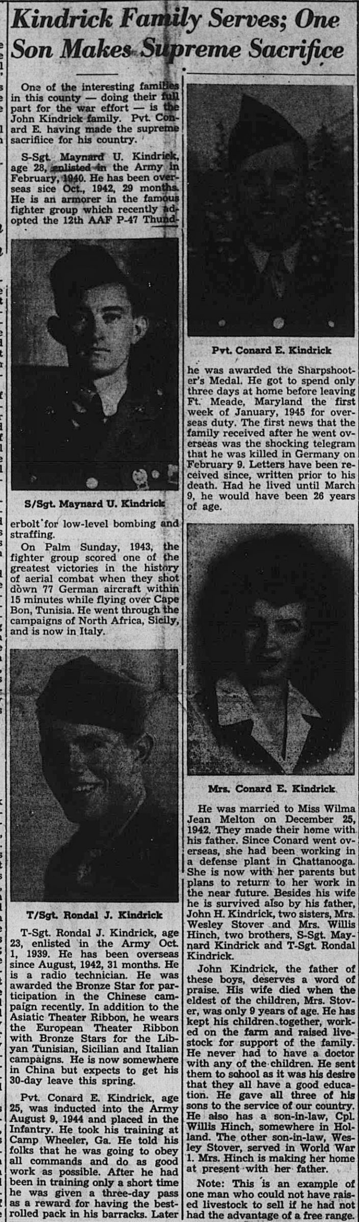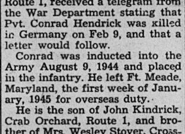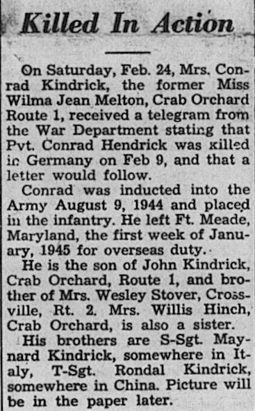 On Saturday, Feb. 24, Mrs. Conrad Kindrick, the former Mill Wilma Jean Melton, Crab Orchard, Route 1, received a telegram from the War Department stating that Pvt. Conrad Hendrick was killed in Germany on Feb. 9, and that a letter would follow. Conrad was inducted into the Army August 9, 1944 and place in the infantry. He left Ft. Meade, Maryland, the first week of January, 1945 for overseas duty. He is the son of John Kindrick, Crab Orchard, Route 1, and brother of Mrs. Wesley Stover, Crossville, Rt. , Mrs. willis Hinch, Crab Orchard is also a sister. His brothers are S-Sgt Maynard Kindrick, Rondal Kindrick, somewhere in China.