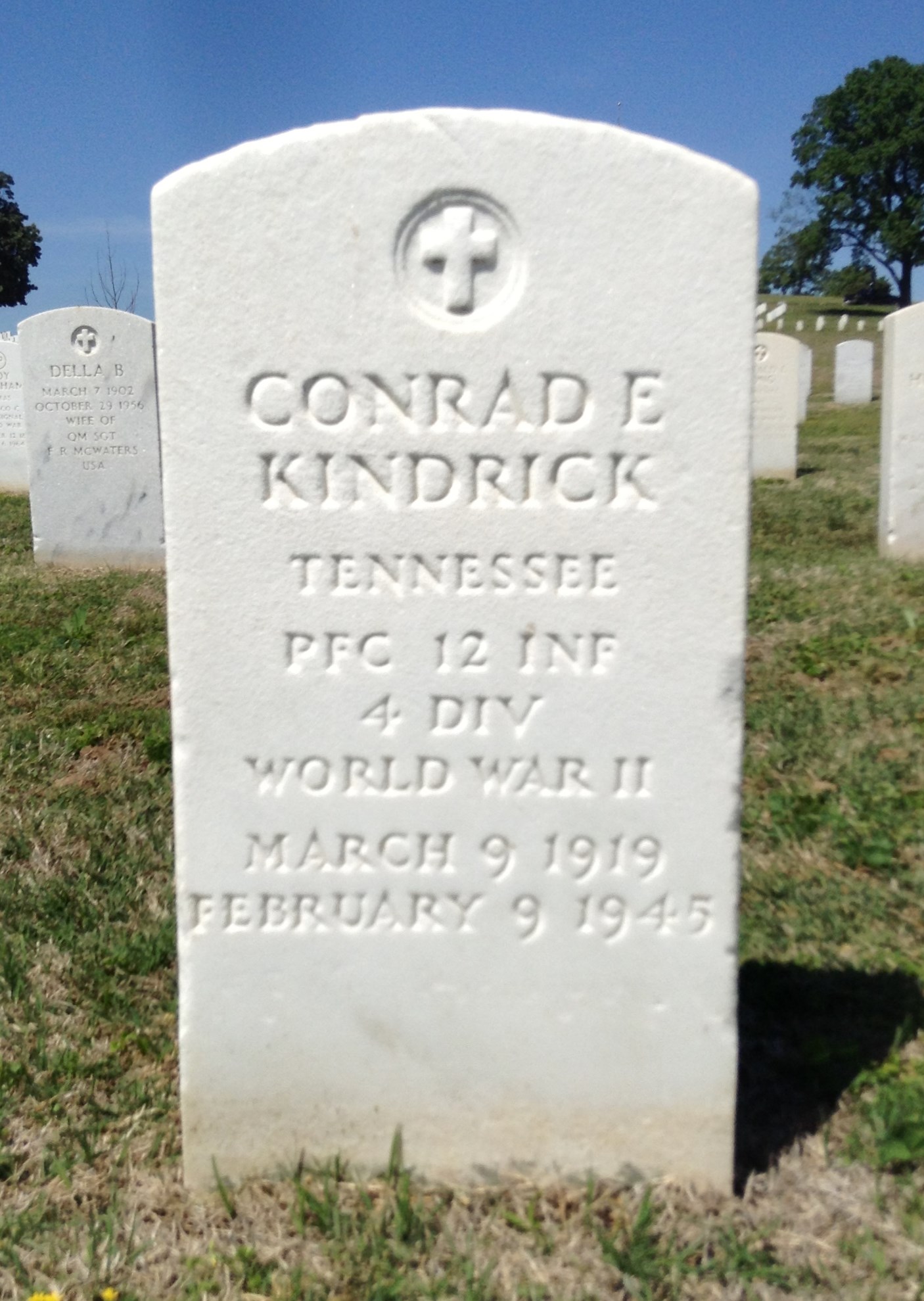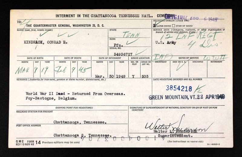 PFC Kindrick was returned from Foy-Bastogne, Belgium. He is buried at the Chattanooga National Cemetery, Y, 503.