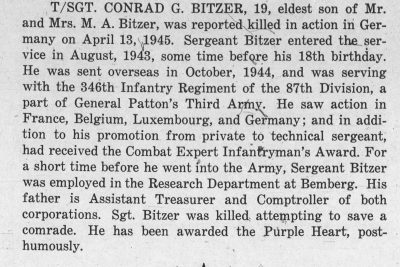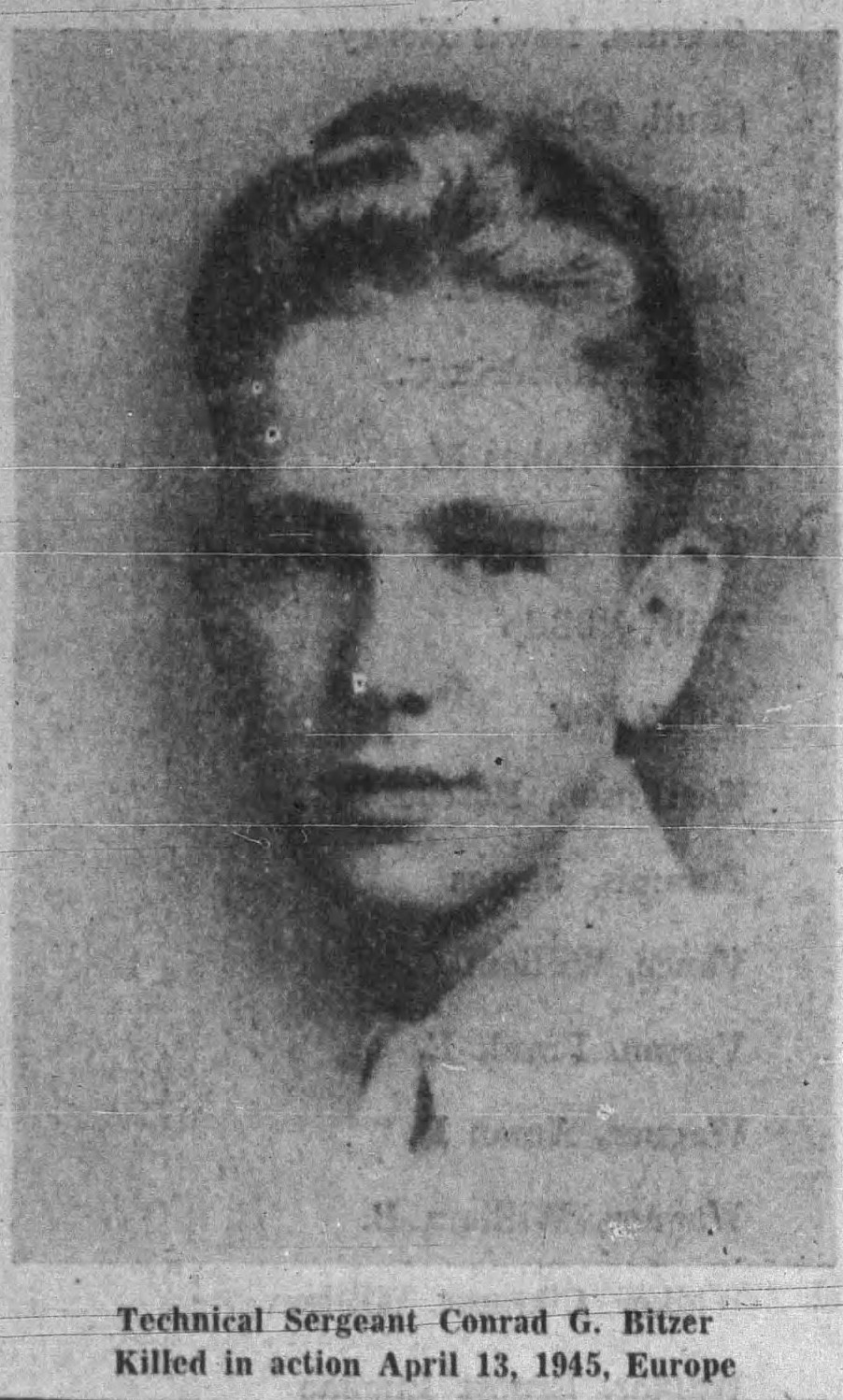 Conrad was the son of Medon Amandus and Helga Margarata Bitzer, both of Ontario, Canada. His younger brother Medon Don Armin Bitzer followed Conrad to the Tennessee Military Institute and was accepted to the United States Military Academy at West Point, New York, Class of 1950. Don was a Fighter Bomber pilot in the United States Air Force and was killed in action during the Korean War. His remains were never recovered and he has a memorial marker right next to Conrad.