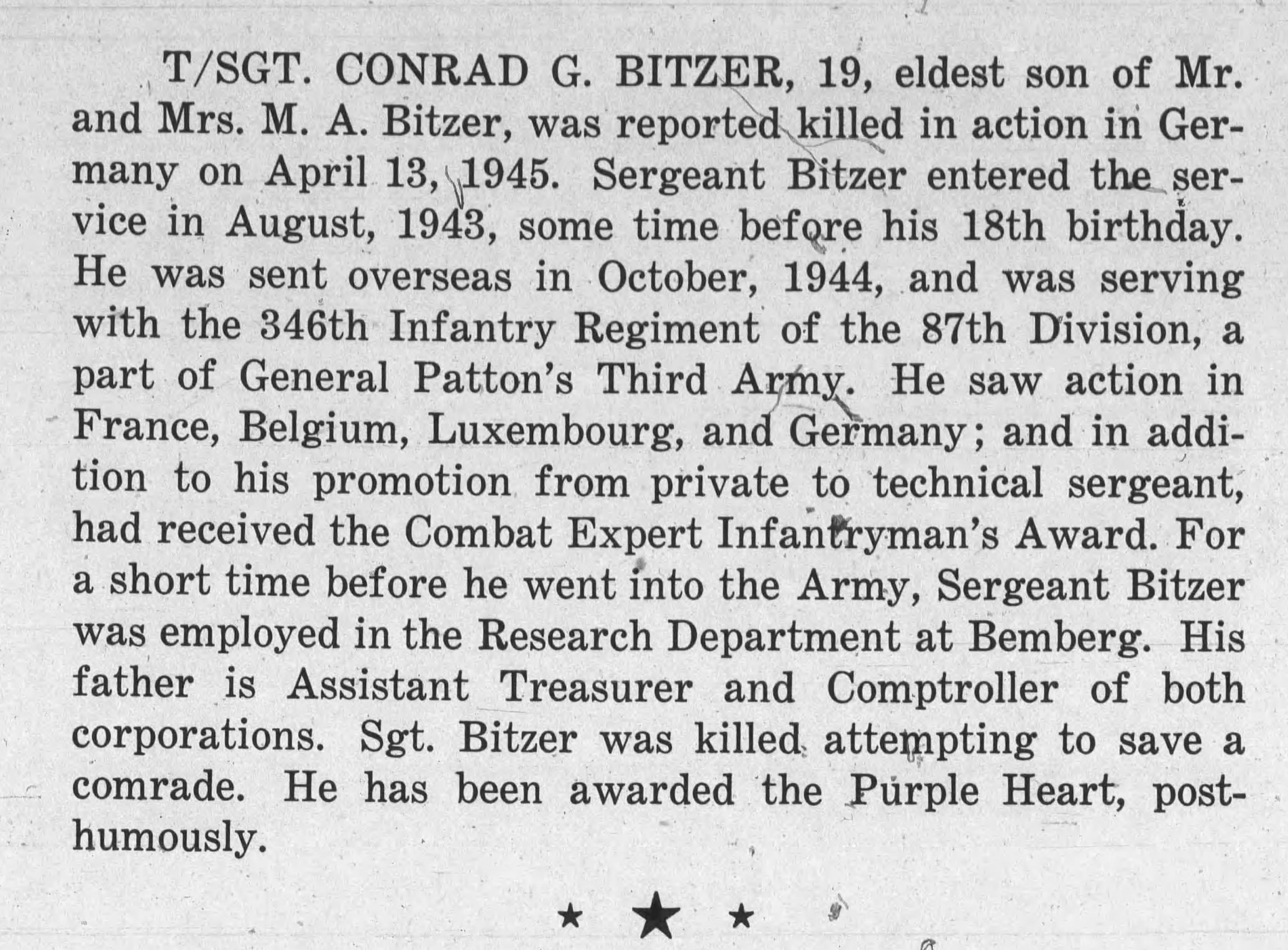 Note: Guenther dropped his first name and took his middle as his first when he applied to TMI. All his records from that point on lists him as Conrad G. Bitzer. The only thing that differs from that is his grave marker. Rest In Peace my young Warrior…