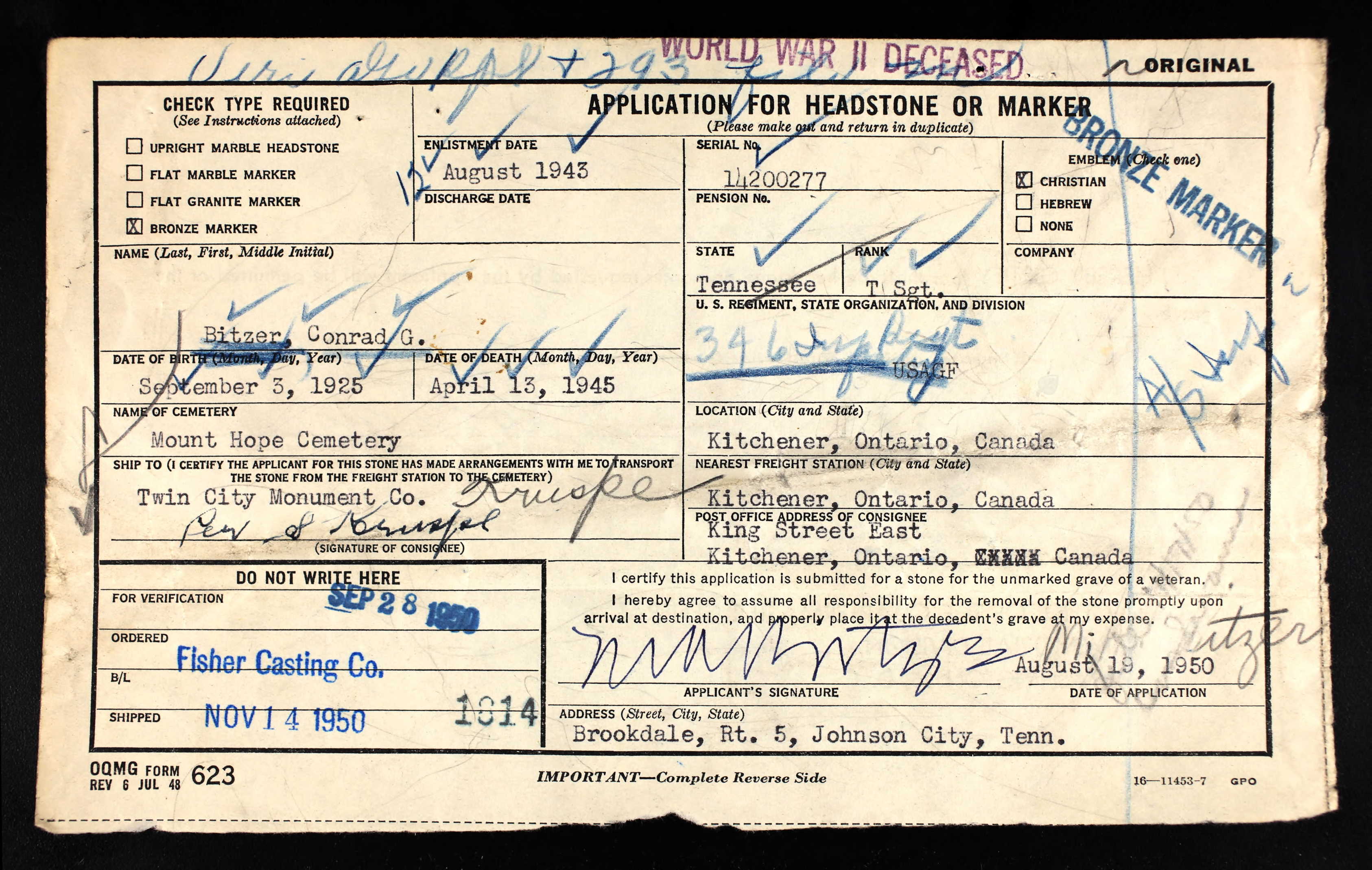 Conrad was first interred in the United States Military Cemetery Eisenach, Germany on 15 April 1945 in Plot A, Row 11, Grave 259. On 25 June 1945, he was moved to the United States Military Cemetery Margarten, Holland and placed in Plot QQ, Row 11, Grave 259. Conrad was disinterred again on 3 September 1948 and his journey to his final resting place began. He arrived Kitchener, Ontario, Canada on 14 July 1949 via New York Central Railway Train #99 at 1945 hours and was laid to rest the next day with his family present. Conrad now rests in Mount Hope Cemetery, Protestant Lot 262, Grave 6 in Kitchener, Ontario.