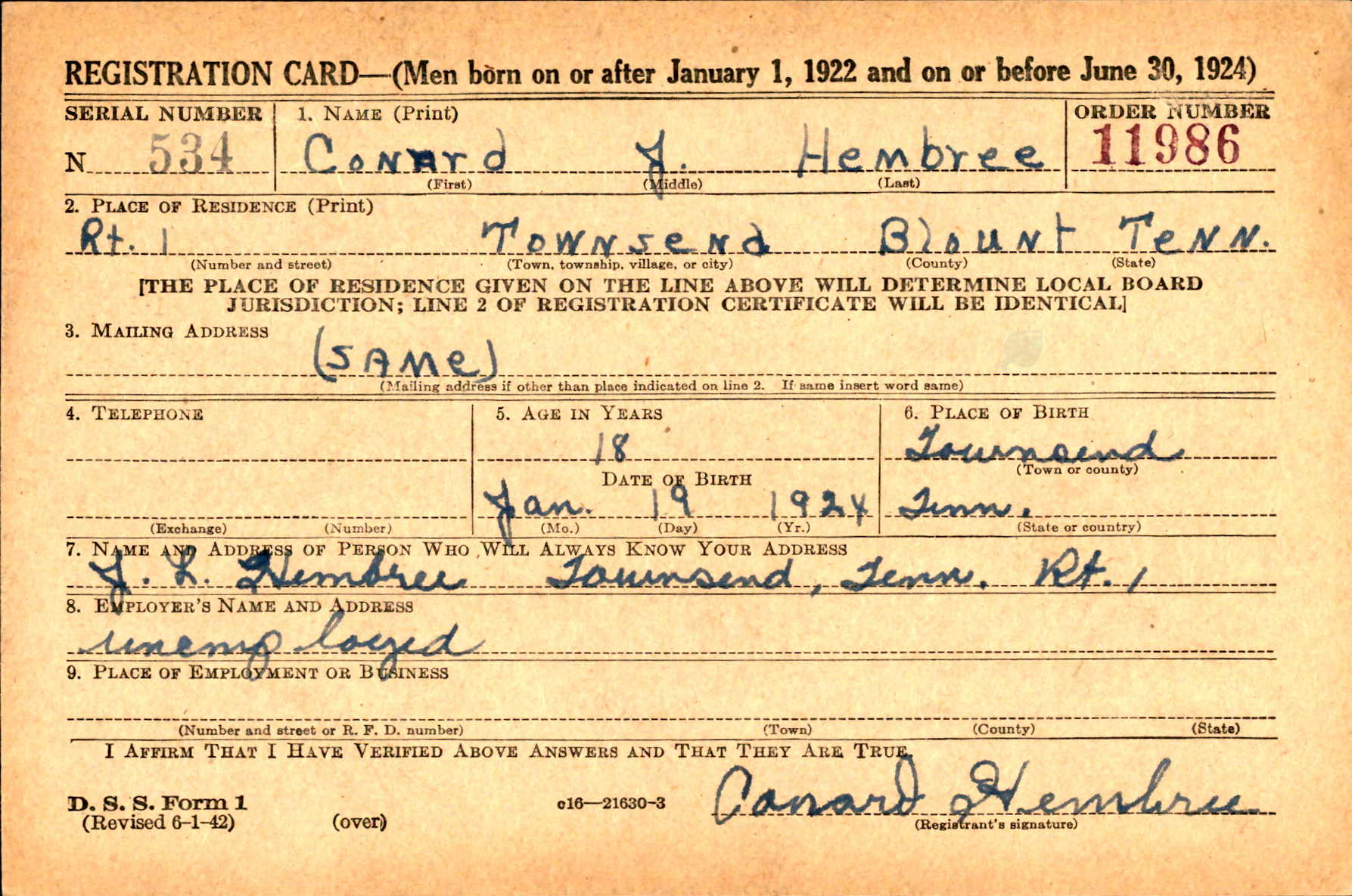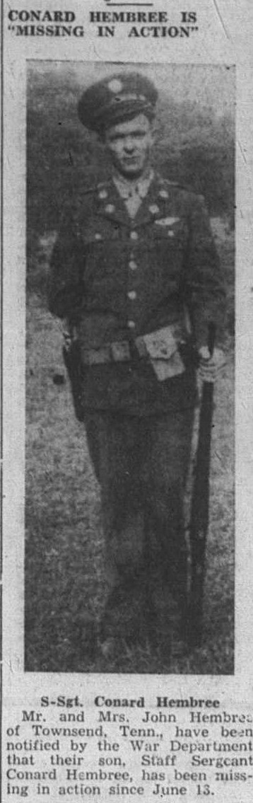 Staff Sergeant Conrad J. Hembree was born on January 19, 1924, in Tuckaleechee, Tennessee. He was the son of John Lewis Hembree and Mary Jane Abbott Hembree. He was the brother of John Natahaniel Hembree, Lula Mae Hembree, Edna Mabel Hembree, Earl Hembree, James Howell Hembree, Paul Hembree, and Lucy Hembree.
