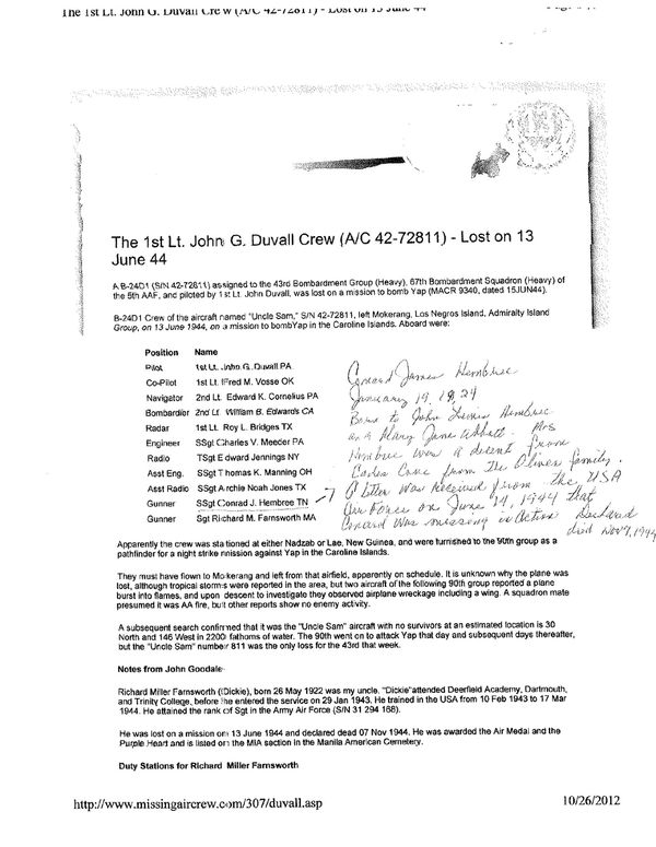 1Lt Vosse was co-pilot aboard 64th BS, 43rd BG B-24D 42-72811, which went missing on a mission to Yap on June 13, 1944. The crew for this mission was as follows