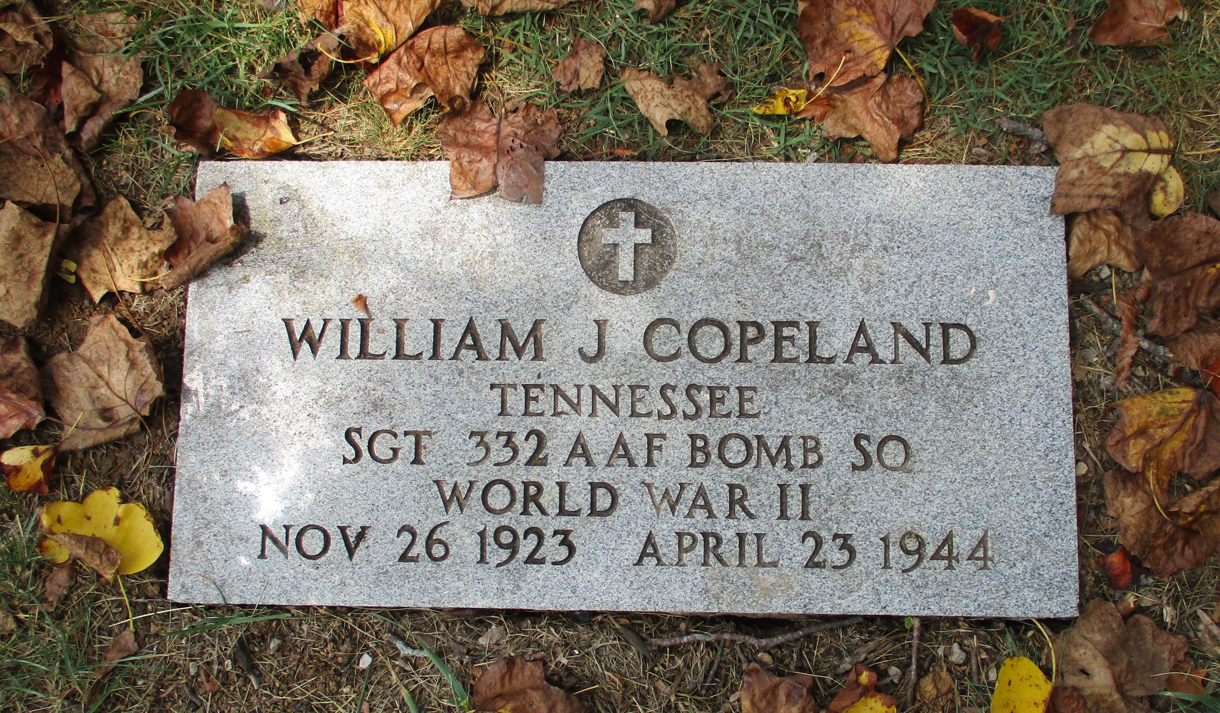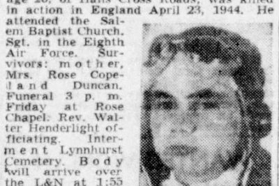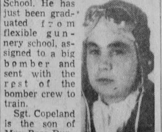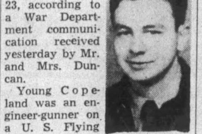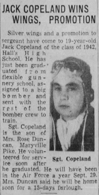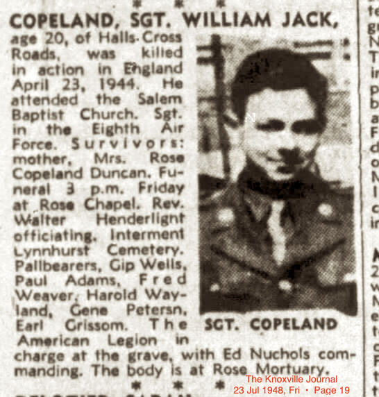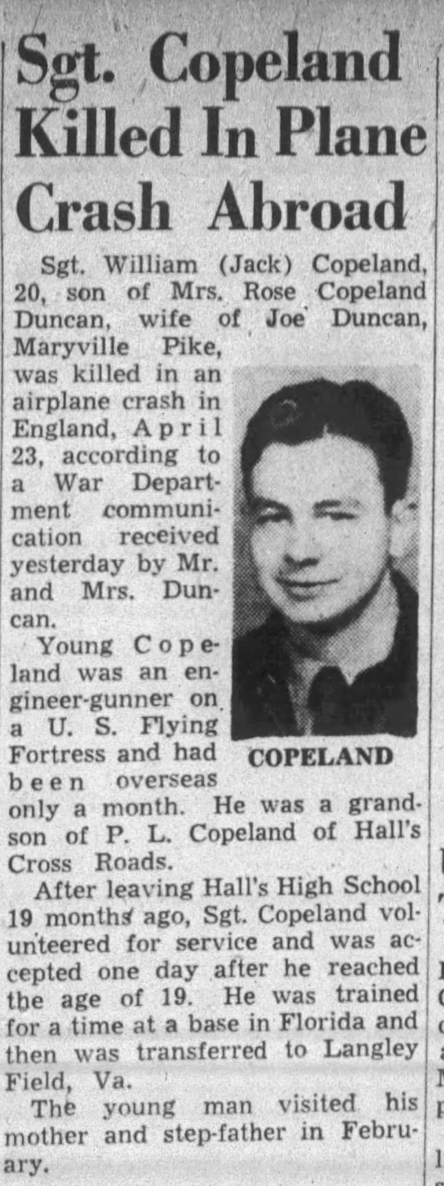 Sgt. William (Jack) Copeland, 20, son of Mrs. Rose Copeland Duncan, wife of Joe Duncan, Maryville Pike, was killed in an airplane crash in England April 23, according to a War Department communication received yesterday by Mr. and Mrs. Duncan. Young Copeland was an engineer-gunner on a U.S. Flying Fortress and had been overseas only a month. He was a grandson of P.L. Copeland of Halls Cross Roads. After leaving Halls High School 19 months ago, Sgt. Copeland volunteered for service and was accepted one day after he reached the age of 19. He was trained for a time at a base in Florida and then was transferred to Langley Field, Va. The young man visited his mother and step-father in February.