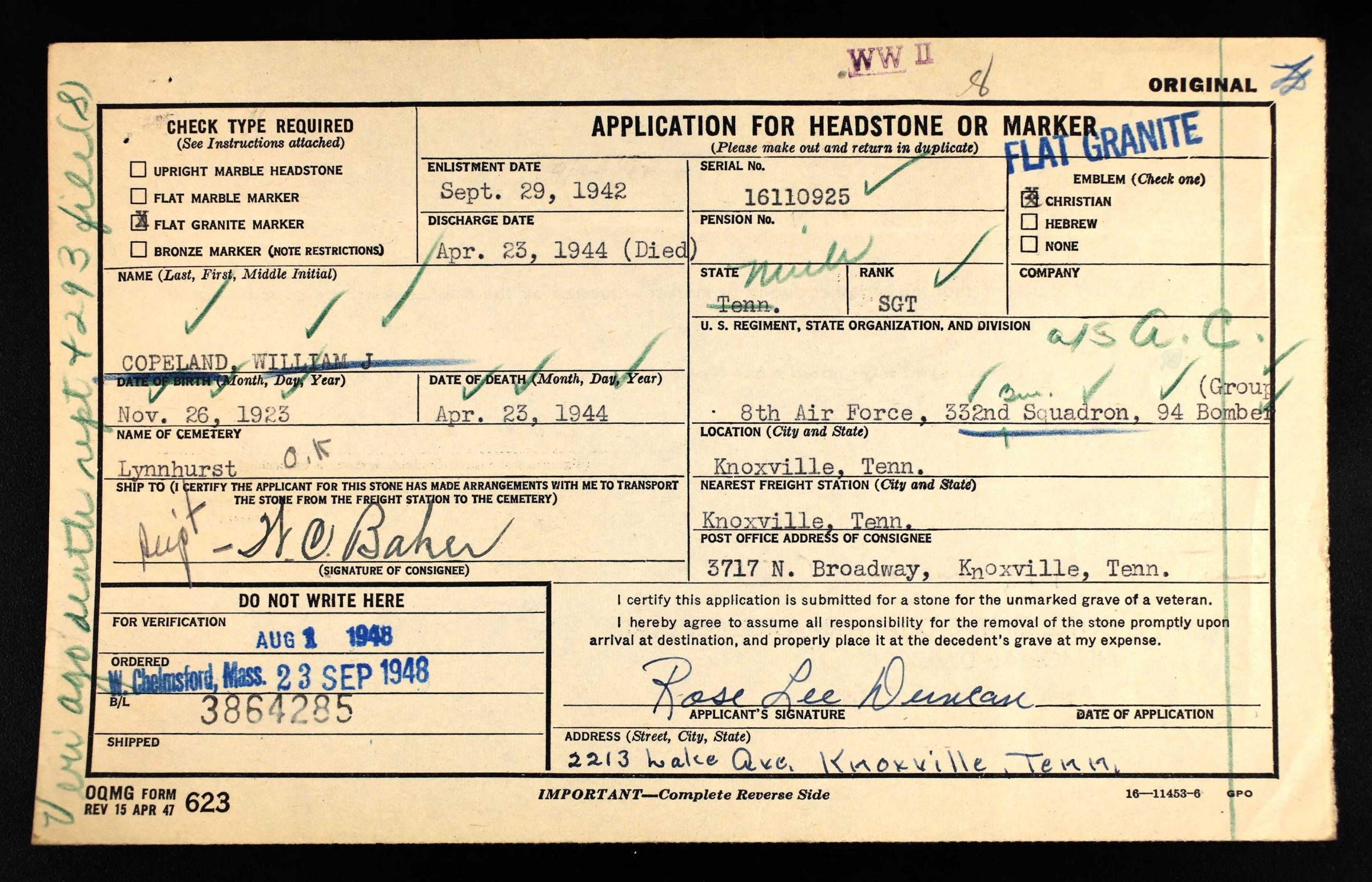 William Jack Copeland was born in Tennessee, Son of Rose Lee Copeland and step-son of Josaih Cosby Duncan. He attended 3 years of high school and was a skilled mechanic and repairman before he entered the service on 29 September 1942 from Michigan. Sgt Copeland died non battle in England. He was a Left Waist Gunner (ASN 16110925).