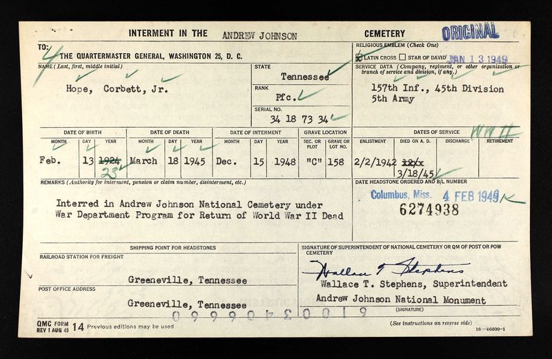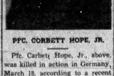 Pfc. Corbett Hope Jr. was killed in action in Germany, March 18, according to a recent telegram from the War Department received by his parents in this city. Pfc. Hope, aged 21, was in service three years and served 23 months overseas. He was a veteran of the Sicilian campaign, and landed in France on D-Day. He was presented the Combat Infantry Badge and was awarded a citation for bravery by General Clark in the Anzio Beachhead battle. In addition to his parents, he is survived by one sister, Mrs. Virginia Hartman and one brother, Henry Allen Hope.