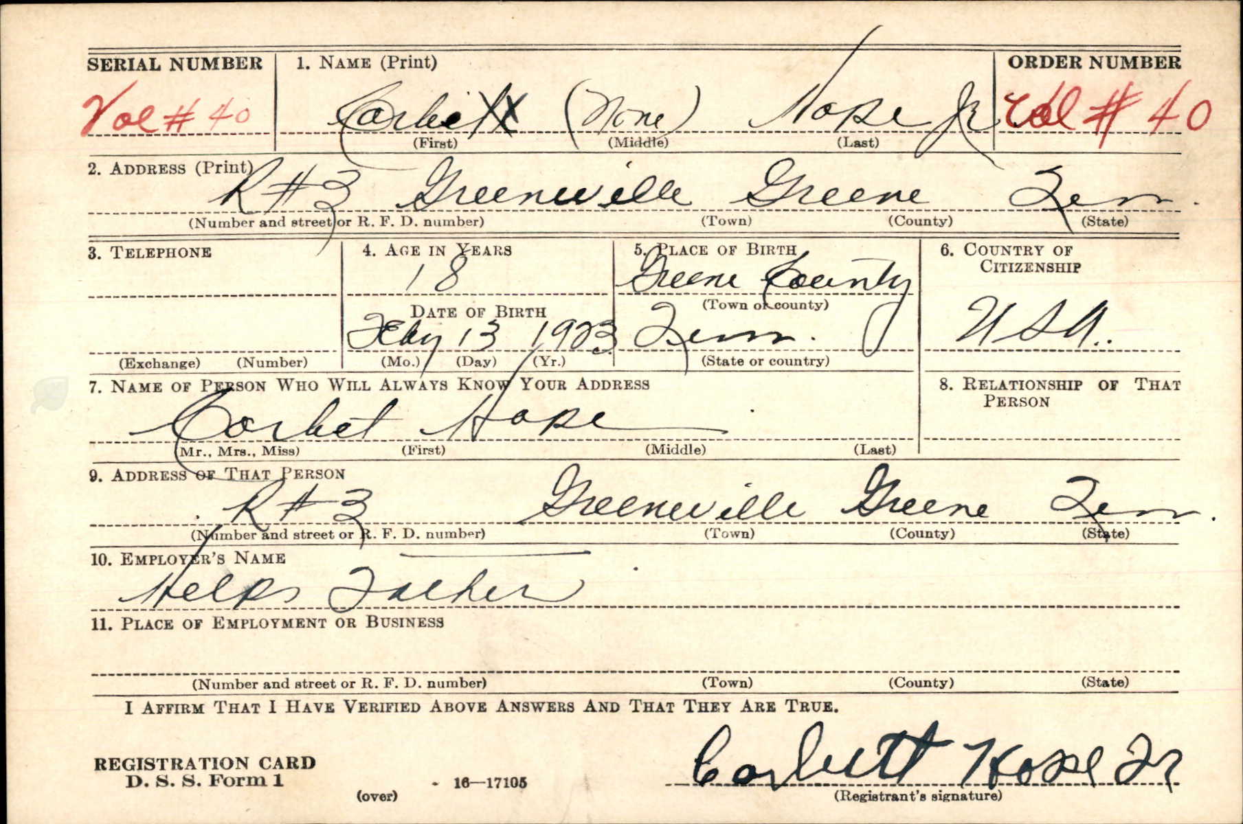 Corbett Hope was born on 13 February 1923, the son of Corbett Hope Sr. and Mattie Ruth Young.