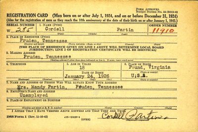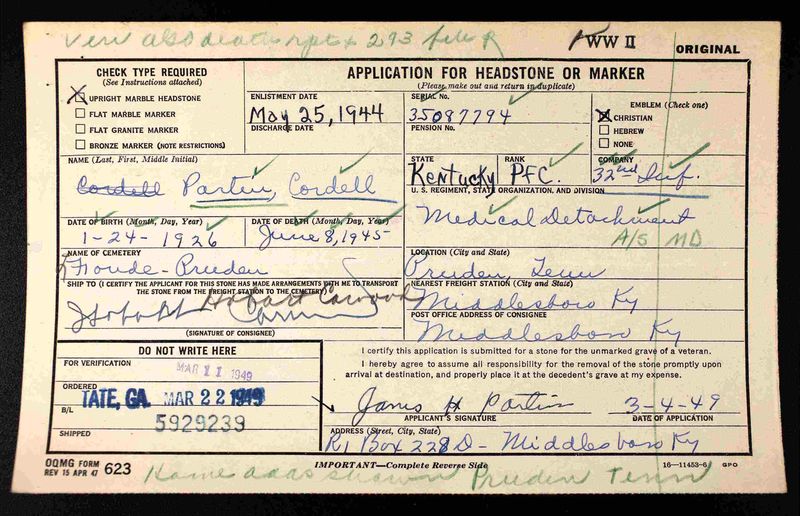 Funeral services for Pfc. Cordell Partin, 19, who was killed on Okinawa June 8, 1945, were held at his home with Rev. James Longsworth and Rev. Paul Grubbs officiating. Burial was in Pruden-Fonde cemetery. He is survived by his parents, Mr. and Mrs. J.H. Partin; brother Willie and sisters, Mrs. Lillie Mae Beeler of Knoxville, Mrs. Mary Daugherty, Melva, Barbara Jean, Charlene, Geneva, Shirley Ann, Nancy Sue and Lila Partin of Middlesboro and grandfather, Paris Mullins of Virginia.