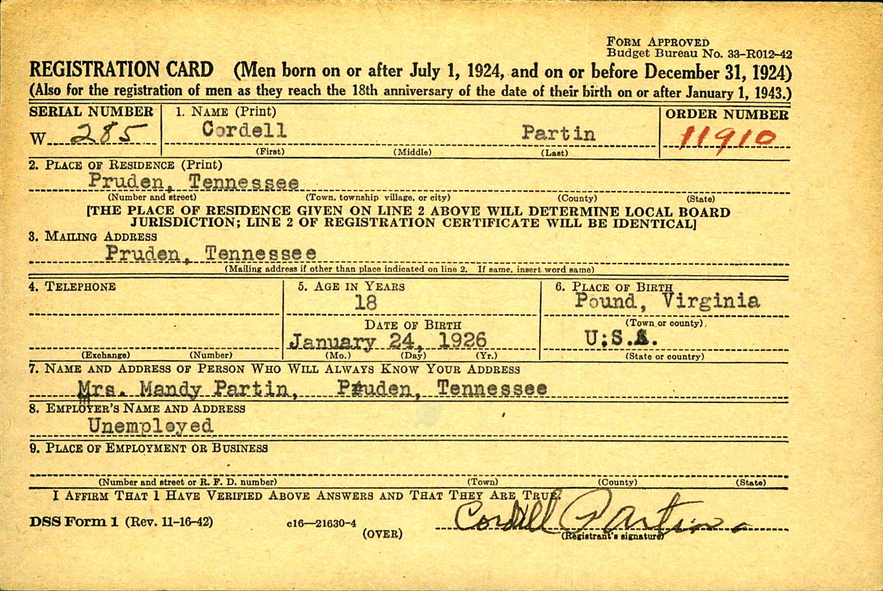 Cordell Partin was born on 24 January 1926 in Pound, Virginia. He was the son of James “Jim” Henry Partin and Mandy Jane Mullins.