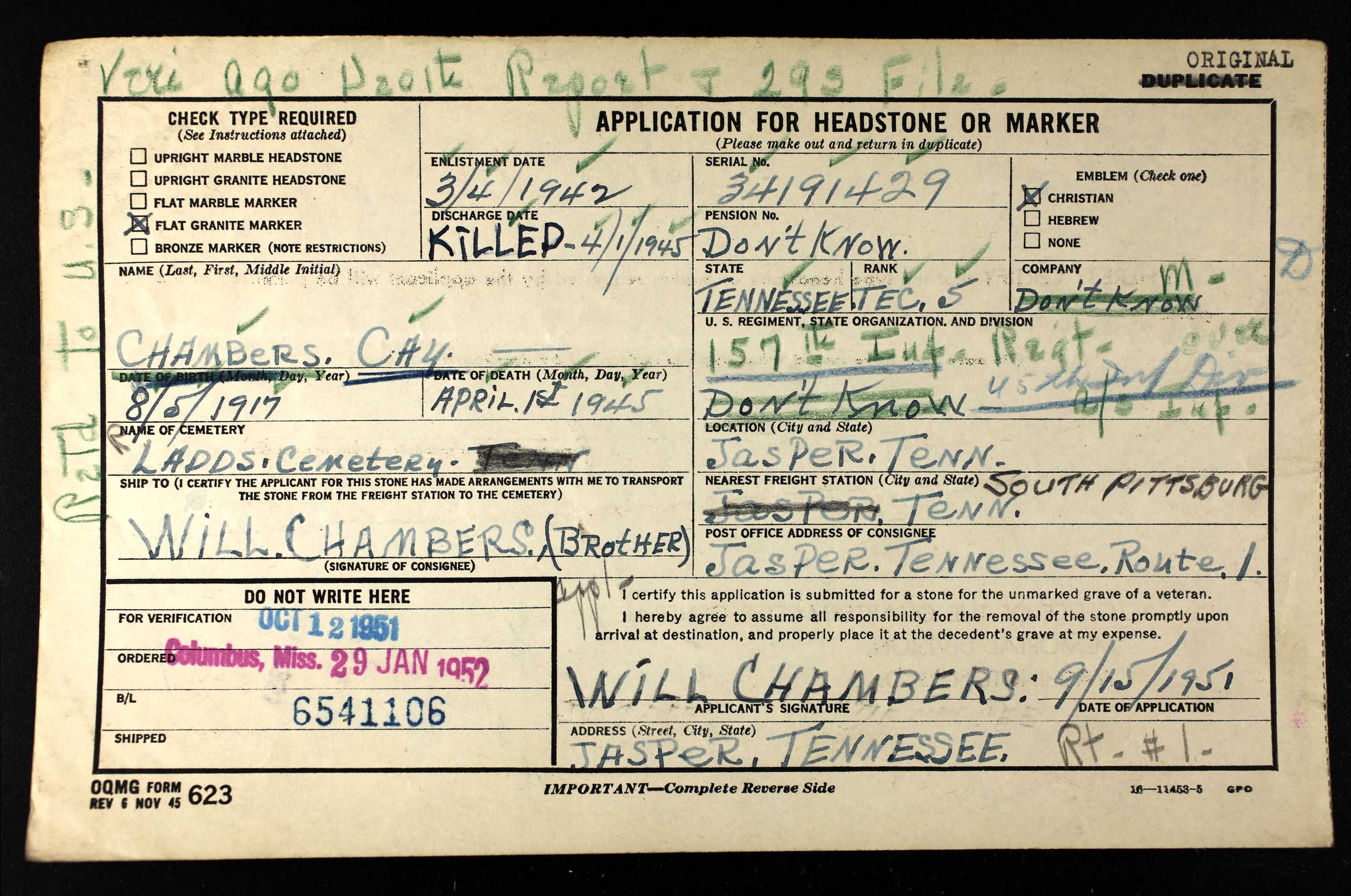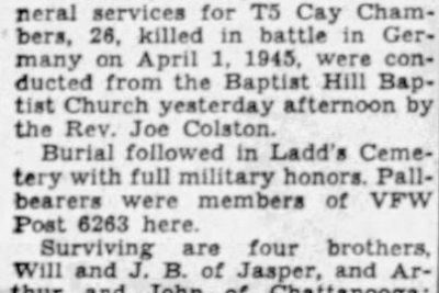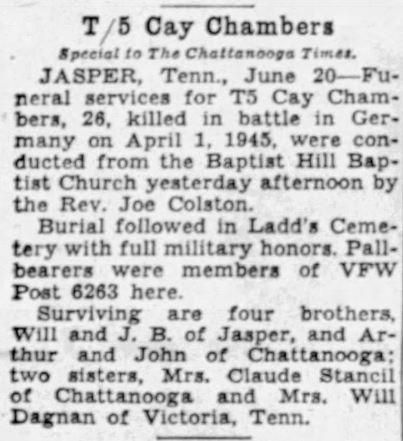 Cpl. Chambers, whose wife is now employed at the Bell Bomber plant at Marietta, Ga., is the brother of Will, Arhtur and John Chambers of Chattanooga, J.B. Chambers of Jasper, Tennessee, and Mrs. Anna Mae Stencil of Chattanooga, and Mrs. Esther Dagley of Jasper, Tenn. Another brother, Pvt. Luther Chambers, died at FortBenning, Ga., and his parents died while he was overseas. He attended schools in Jasper, Tenn., and he had been overseras since May, 1943. He was killed in action on April 1.