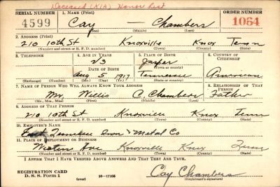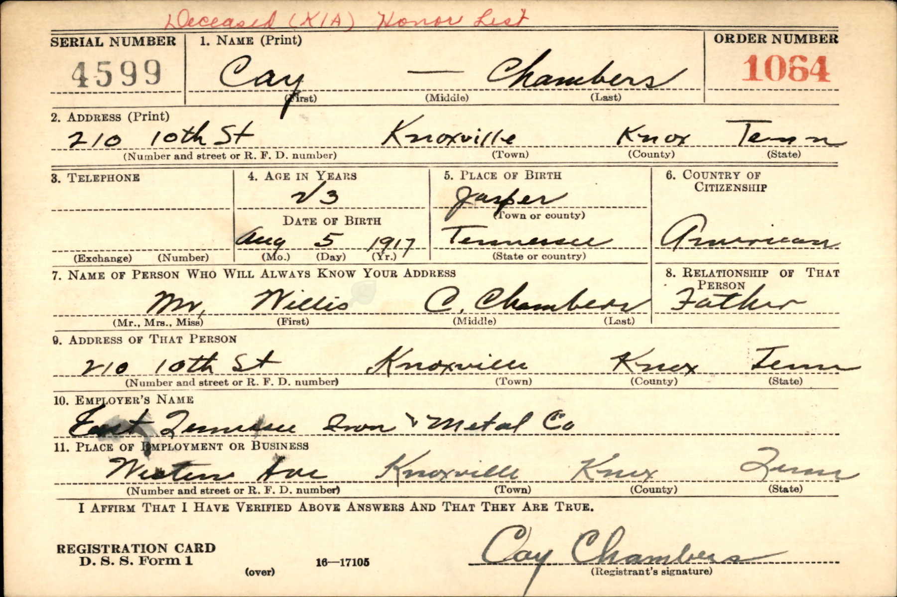Coy (also Cay) Chambers was born on 8 August 1917, the son of Walter C. Chambers and Mary Ellen Cox. Husband of Vine Chambers. Brother of Pfc. Luther Chambers.