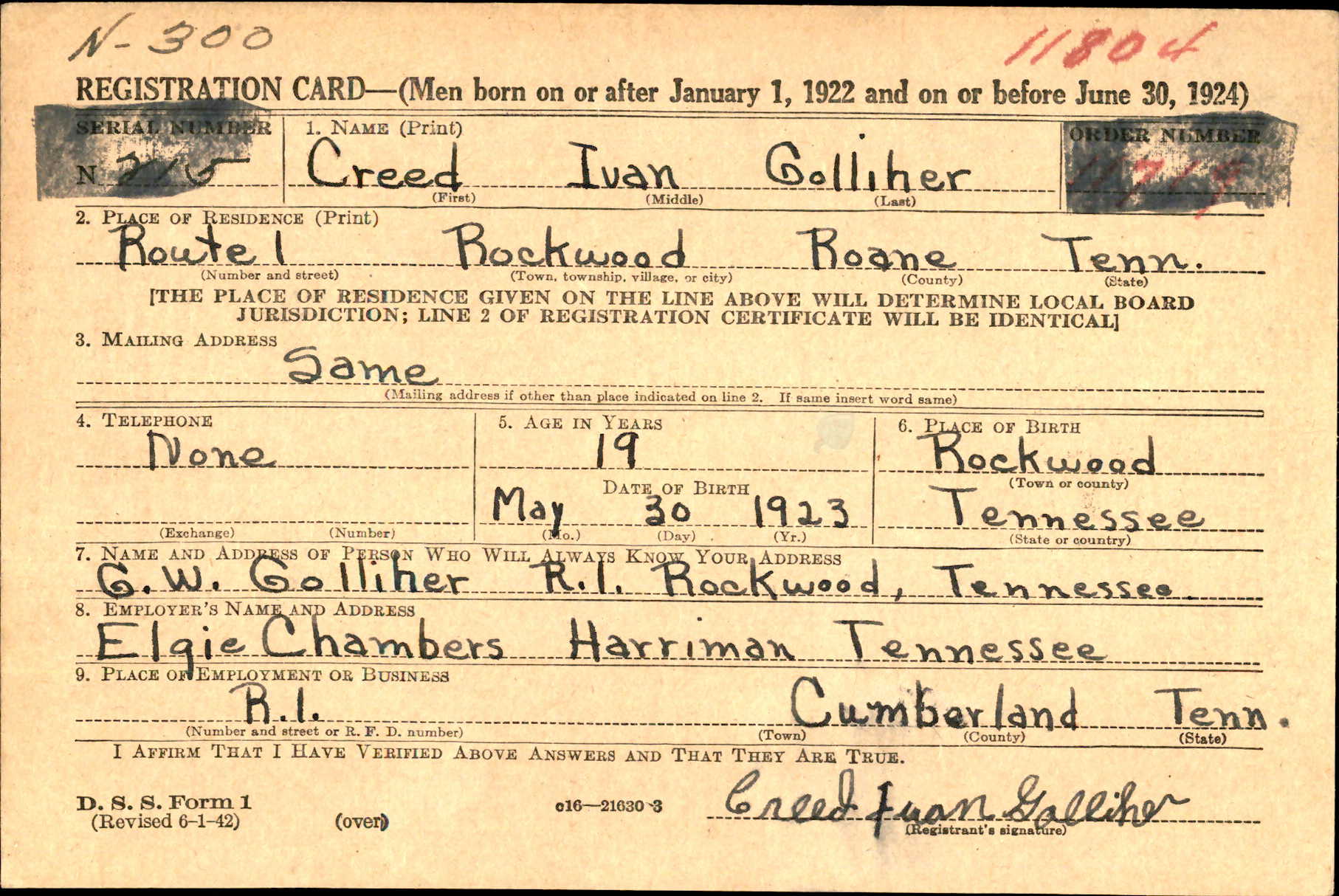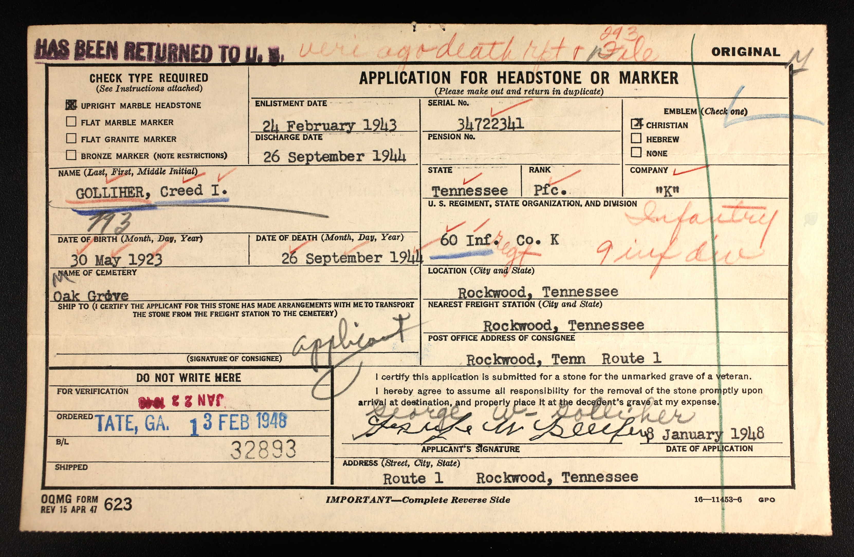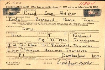Private Creed I. Golliher, age 23, of Rockwood, Rt. 1, Mountain Road, enlisted in the United States Army in February 1943 and died in Belgium on September 26, 1944. He was serving with the US Army 60th Infantry, 9th Infantry Division. He had been overseas for 14 months. He was survived by parents, Mr. and Mrs. G.W. Will Golliher of Rockwood, five sisters, Mrs. Raymond Irwin, Mrs. Marian Hicks, Mrs. Wd Kindred, Mrs. Creed Russell, Mrs. Edwin Kindrick, and three brothers, Claude, Fred, and Carl. Funeral services were held 2 p.m. December 4, 1947, at Rockwood Baptist Church. He was interred in Oak Grove Cemetery in Rockwood.