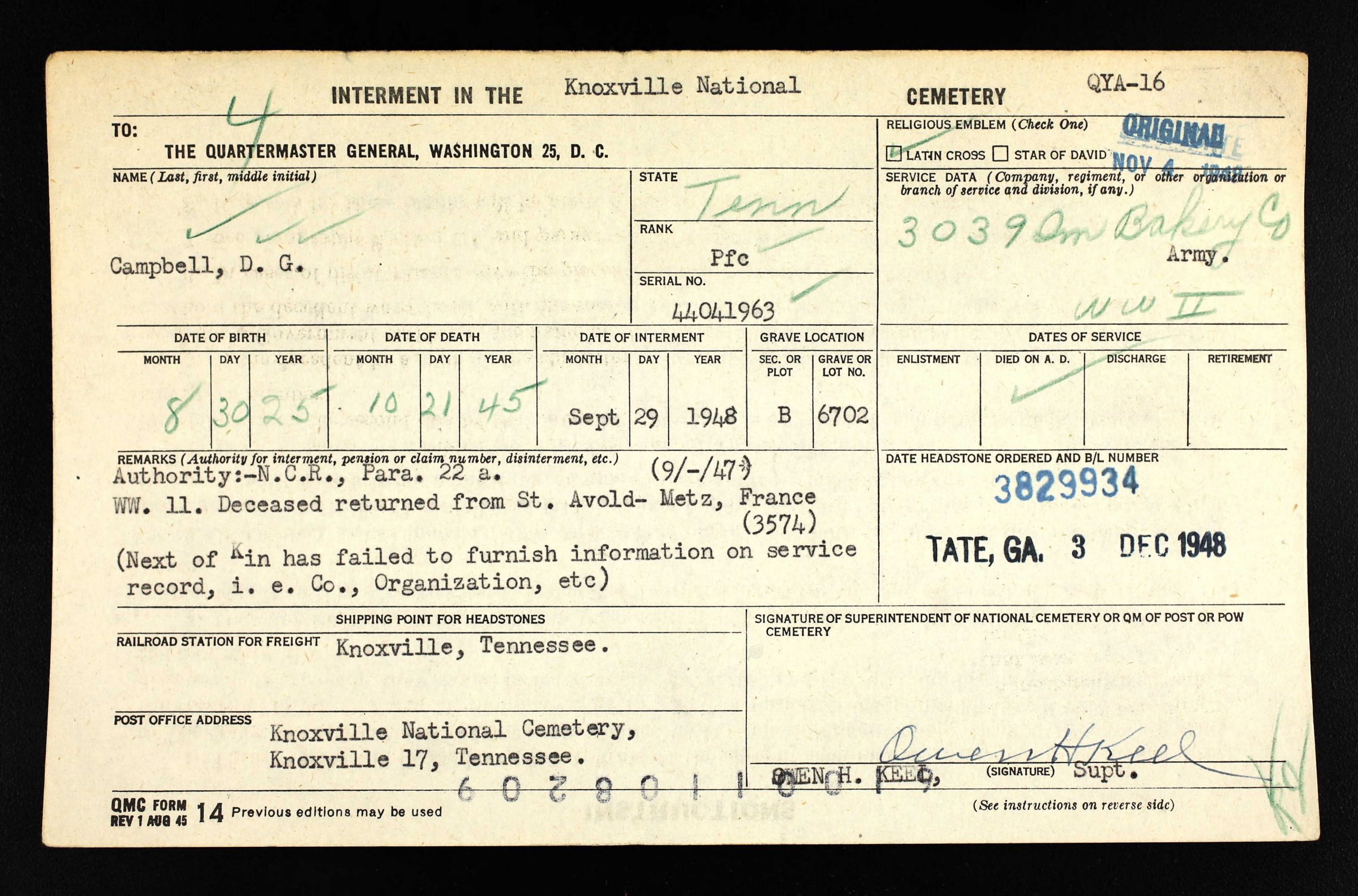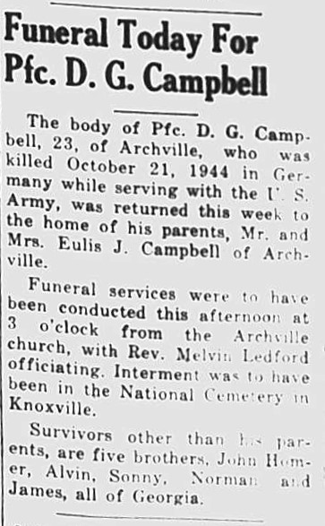 The body of Pfc. D.G. Campbell, 23, or Archville, who was killed October 21, 1944 in Germany while serving with the U.S. Army, was returned this week to the home of his parents, Mr. and Mrs. Eulis J. Campbell of Archville. Funeral services were to have been conducted this afternoon from the Archville church. Interment was to have been in the National Cemetery in Knoxville. Survivors other than his parents are five brothers, John Homer, Alvin, Sonny, Norman and James, all of Georgia.