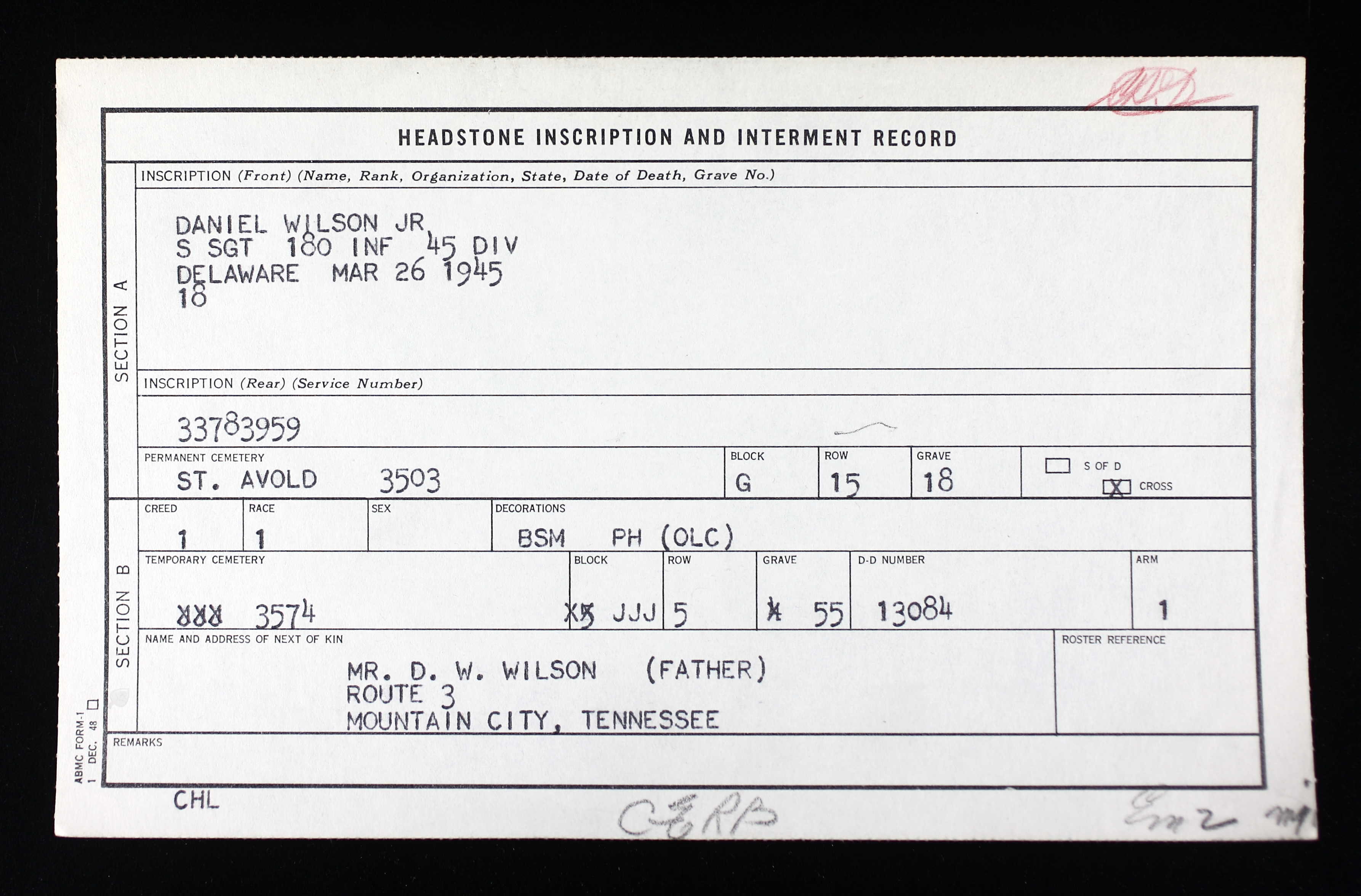 Daniel, who resided in New Castle, Delaware, served as a Staff Sergeant with the 180th Infantry Regiment, 45th Infantry Division, U.S. Army during World War II.