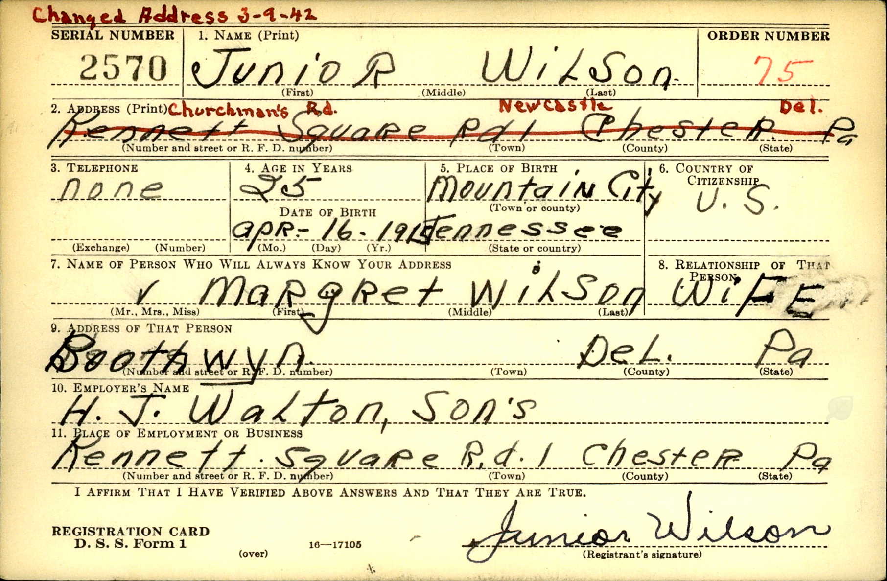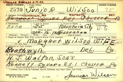 Daniel Webster “Junior” Wilson was born on 20 April 1915, Mountain City, Tennessee, son of Daniel Webster Wilson, Sr. and Jessie Jenkins Wilson. Husband of Margaret Elizabeth Clough. He enlisted in the Army on June 3, 1943 in Philadelphia, Pennsylvania.