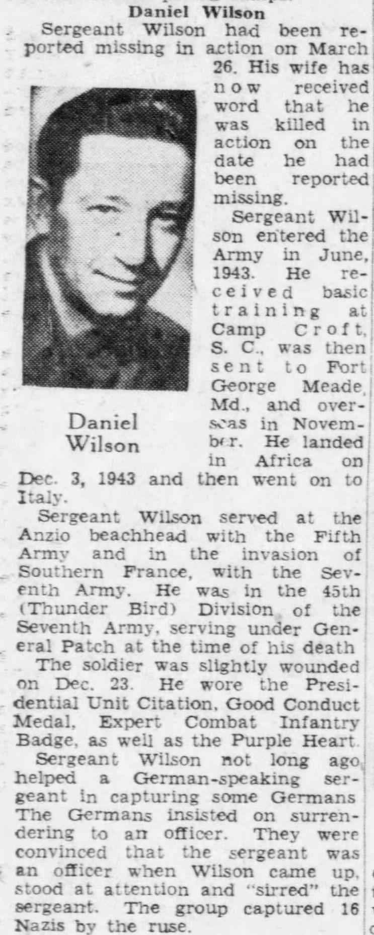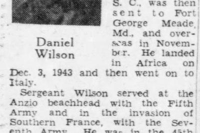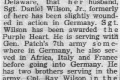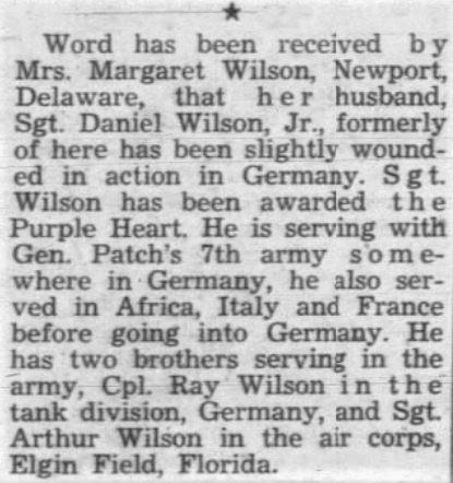 Word has been received by Mrs. Margaret Wilson, Newport, Delaware, that her husband, Sgt Daniel Wilson Jr., formerly of here has been slightly wounded in action in Germany. Sgt. Wilson has been awarded the Purple Heart. He is serving with Gen. Patch’s 7th army somewhere in Germany, he also served in Africa, Italy and France before going into Germany. He has two brothers serving in the army, Cpl. Ray Wilson in the tank division, Germany, and Sgt. Arthur Wilson in the air corps, Elgin Field, Florida.