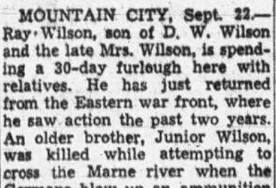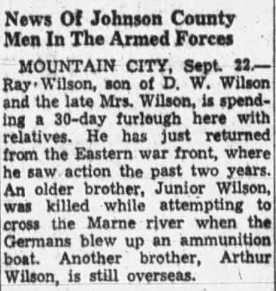 Sergeant Wilson had been reported missing in action on March 26. Hi wife has now received word that he was killed in action on the date he had been reported missing. Sergeant Wilson entered the Army in June, 1943. He received basic training at Camp Croft, S.C., was then sent to Fort George Meade, Md., and overseas in November. He landed in Africa on Dec. 3, 1943 and then went to Italy. Sergeant Wilson served at the Anio beachhead with the Fifth Army and in the invasion of Southern France, with the Seventh Army. He was in the 45th (Thunder Bird) Division of the Seventh Army, serving under General Patch at the time of his death. The soldier was slightly wounded on Dec. 23. He wore the Presidential Unit Citation, Good Conduct Medal, Expert Combat Infantry Badge, as well as the Purple Heart. Sergeant Wilson not long ago, helped a German-speaking sergeant in capturing some Germans. The Germans insisted on surrendering to an officer. They were convinced that the sergeant was an officer when Wilson came up, stood at attention and “sirred” the sergeant. The group captured 16 Nazis by the ruse. Before his induction into the service Sergeant Wilson was employed by the Electric Hose and Rubber company. He is formerly from Mountain City, Tenn. Besides his wife who is residing with her parents at Newport, his father, D.W. Wilson of Mountain City, Tenn., four brothers and two sisters, also survived. Two of the brothers are also serving in the armed forces.