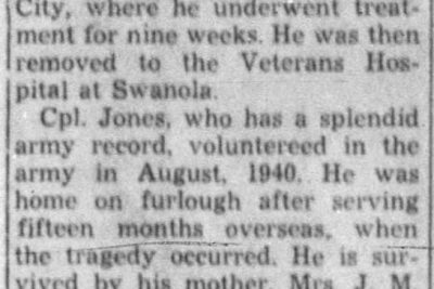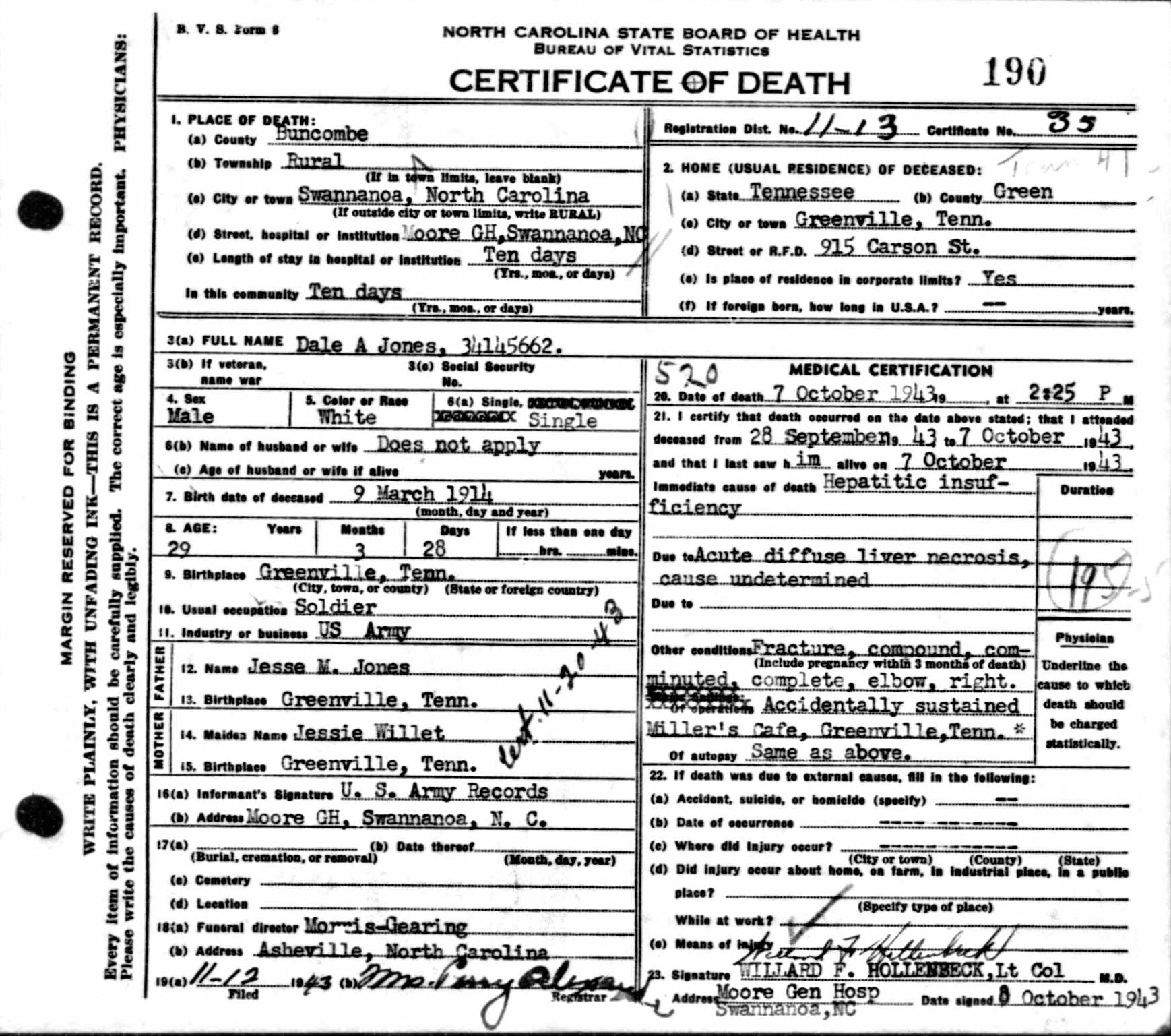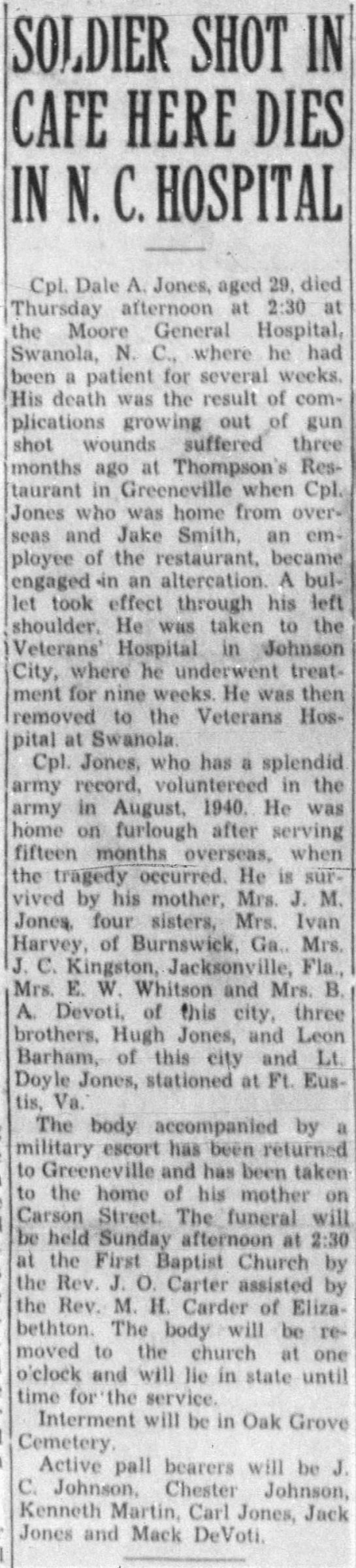 Cpl. Dale A. Jones, aged 29, died Thursday afternoon at 2:30 at the Moore General Hospital, Swanola, N.C. where he had been a patient for several weeks. His death was the result of complications growing out of gun shot wounds suffered three months ago at Thompson’s Restaurant in Greeneville when Cpl. Jones who was home from overseas and Jake Smith, an employee of the restaurant, became engaged in an altercation. A bullet took effect through his left shoulder. He was taken to the Veterans’ Hospital in Johnson City, where he underwent threatment for nine weeks. He was then removed to the Veterans Hospital at Swanola. Cpl. Jones, who has a splendid army recordm volunteered in the Army in August, 1940. He was home on furlough after serving fifteen months overseas, when the tragedy occurred. He is survived by his mother, Mrs. J.M. Jones, four sisters, Mrs. Ivan Harvey, of Brunswick, Ga., Mrs. J.C. Kingston, Jacksonville, Fla., Mrs. E.W. Whitson and Mrs. B. A. Devoti, of this city, three brothers, Hugh Jones and Leon Barham, of this city and Lt. Doyle Jones, stationed at Ft. Eustis, Va.