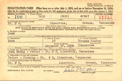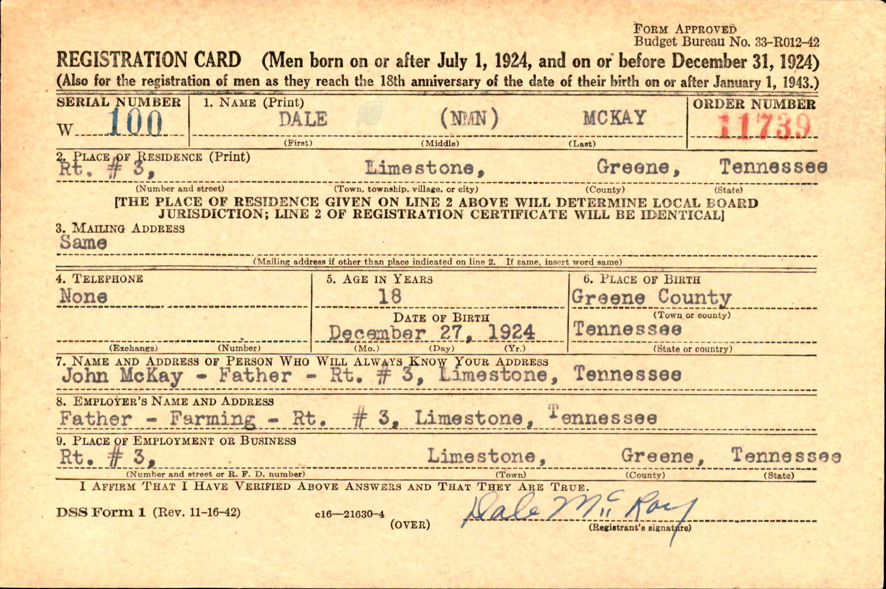 Dale McKay was born in Limestone, Tennessee to John Glenn McKay and Denzie Lloyd.