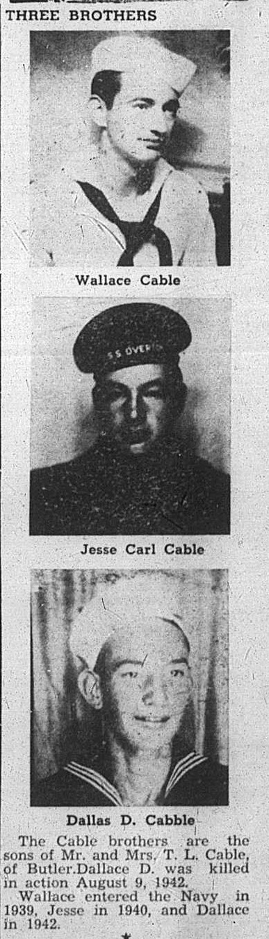 The Cable brothers are the sons of Mr. and Mrs. T.L. Cable, of Butler. Dallace D. was killed in action August 9, 1942. Wallace entered the Navy in 1939, Jesse in 1940 and Dallace in 1942.