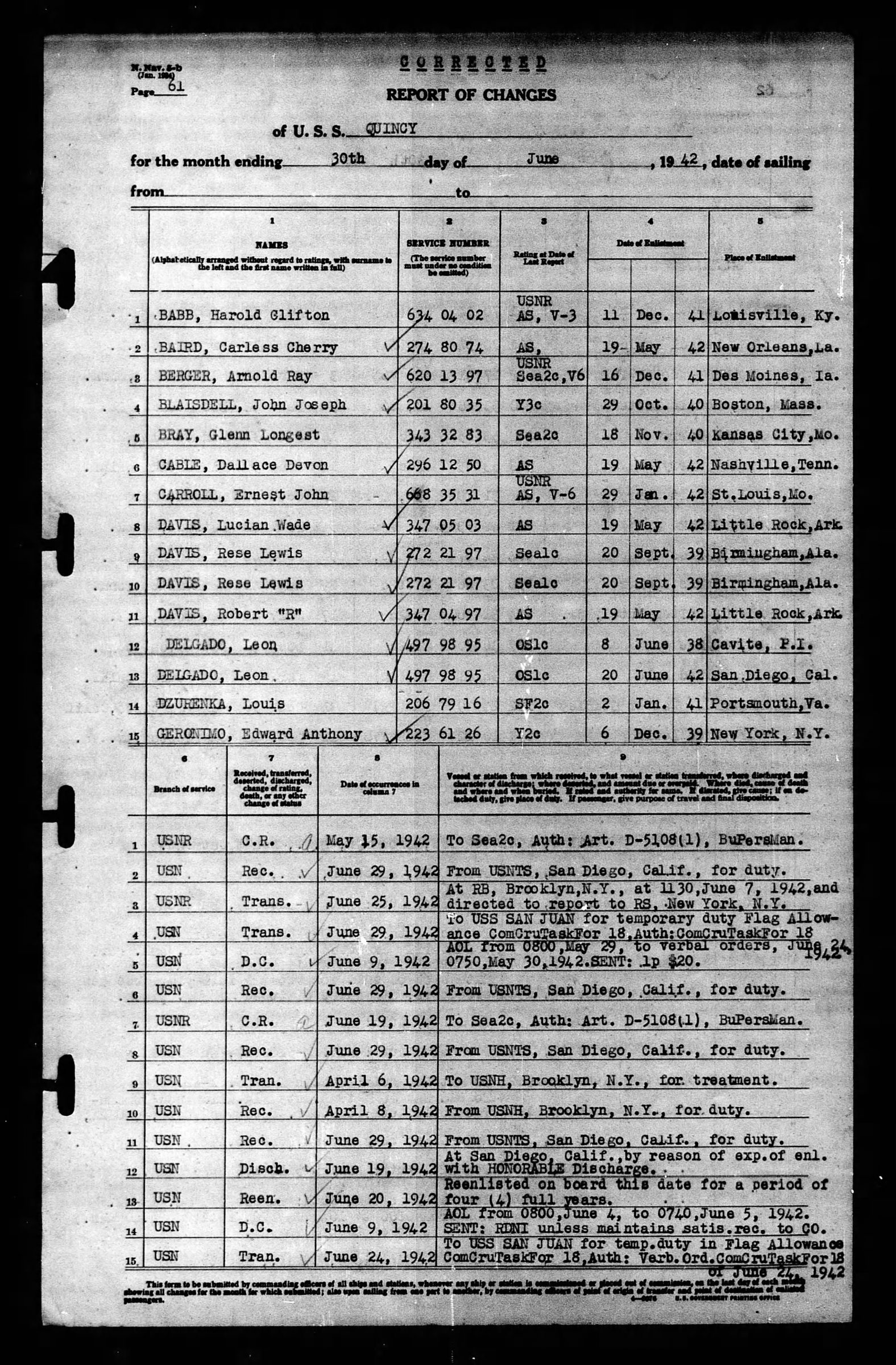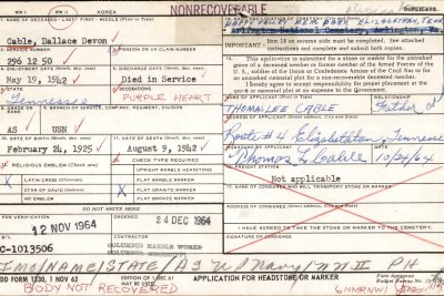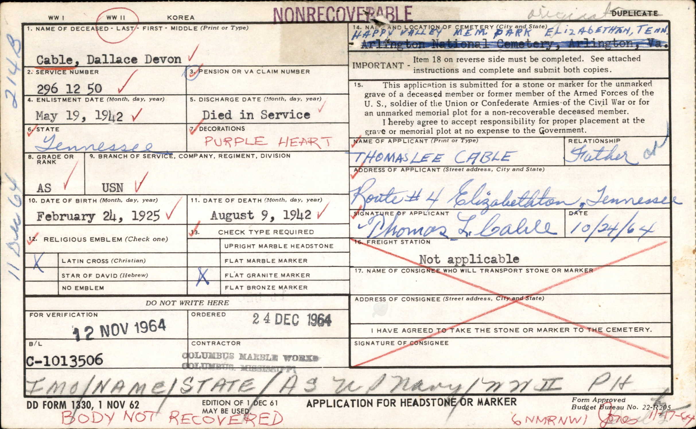 Seaman Dallace Devon Cable was lost on 10 August 1943. He is remembered on the Tablets of the Missing, Manila American Cemetery, Manila, Philippines. He served on the U.S.S. Quincy.