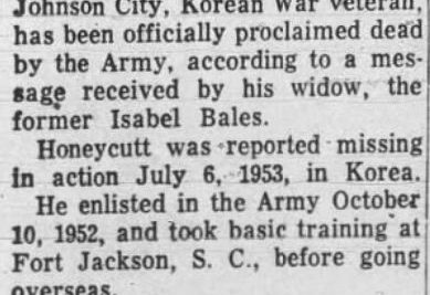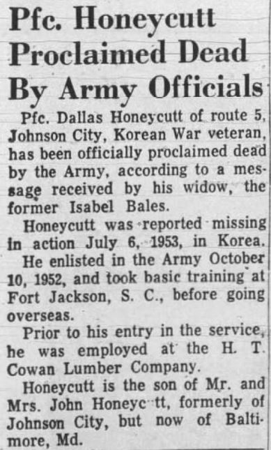 Pfc. Dallas Honeycutt of route , Johnson City, Korean War veteran, has been officially proclaimed dead by the Army, according to a message received by his widow, the former Isabel Bales. Honeycutt was reported missing in action July 6, 1953, in Korea. He enlisted in the Army October 10, 1952 and took basic training at Fort Jackson, S.C., before going overseas. Prior to his entry in the service, he was employed at the H.T. Cowan Lumber Company. Honeycutt is the son of Mr. and Mrs. John Honeycutt, formerly of Johnson City, but now of Baltimore, Md.