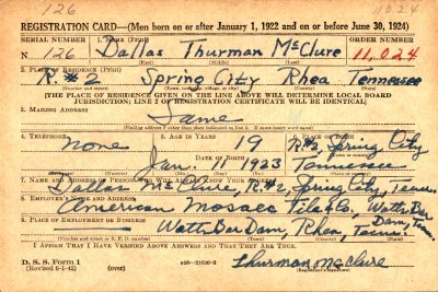 Dallas Thurman McClure was born 11 January 1923 to Dallas Hughel McClure and Bertha Lena Thurman. His half-brother Homer McClure was killed in action in the Pacific.