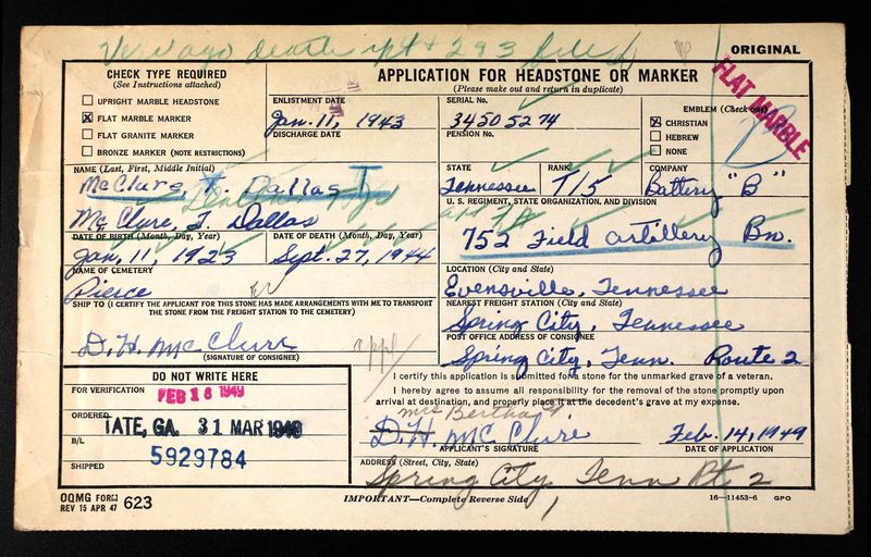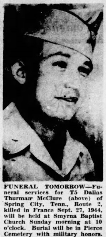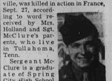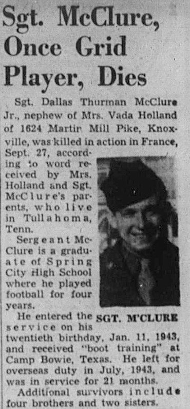 Sgt. Dallas Thurman McClure Jr., nephew of Mrs. Vada Holland of 1624 Martin Mill Pike, Knoxville, was killed in action in France, Sept. 27, according to word received by Mrs. Holland and Sgt. McClure’s parents, who live in Tullahoma, Tenn.