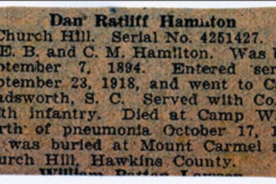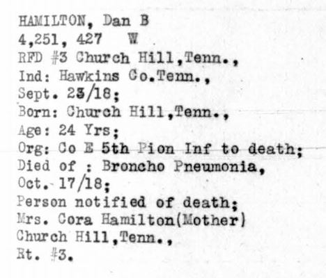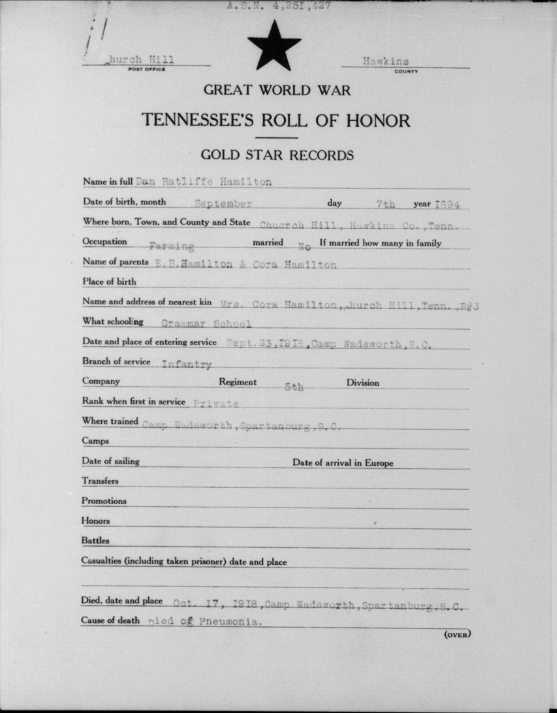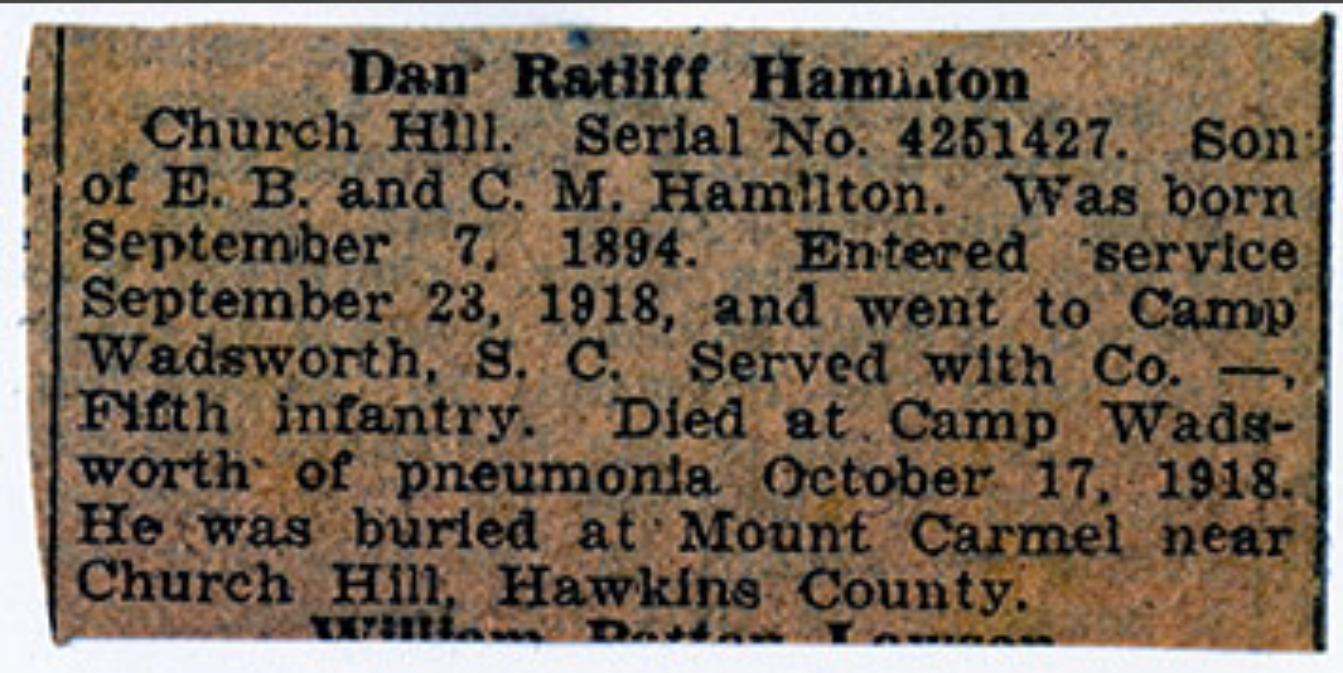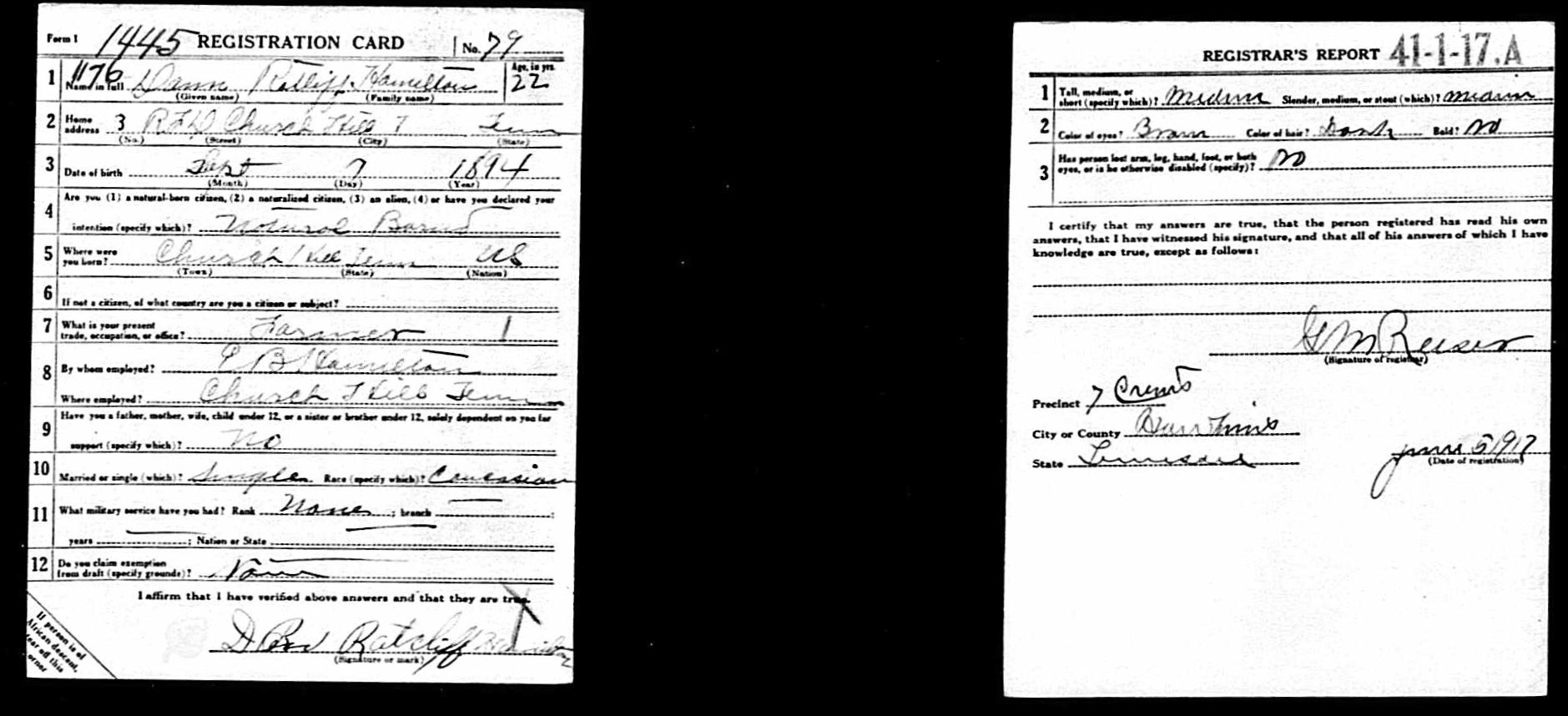 Dan or Daniel Ratliff Hamilton was born in Church Hill, Tennessee. He was the son of Edward Brandon Hamilton and Corena Brown.
