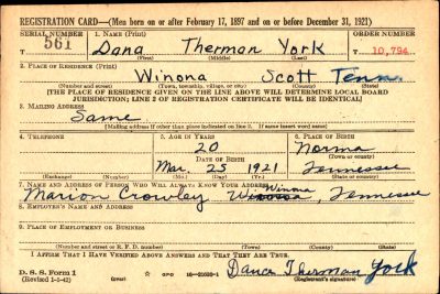 Dana Therman York, was born in 1921 the son of Charlie and Luvernia (Crowley) York. Dana’s mother died soon after his birth and his father died while Dana was less than two years of age. Dorothy, a sister of Luvernia raised Dana from a child. He was born with a birth defect in his hand and at the outset of WWII he was denied entry into the US Army. Afterwards on his second try was admitted and enlisted on October 23, 1942. Pvt. Dana York was assigned to the 82nd Field Artillary Battalion which was assigned to Gen. Douglas MacArthur’s 1st Cavalry Division. In 1943 the !st Cavalry Division was sent to Australia for extensive training. In January 1944, the Battalion’s first engagement was at Oro Bay, New Guinea and from there moved to Los Negros and then on to the Admiralty Islands. Acting on reports from air reconnaissence Gen. MacArthur decided to move ahead with the assault of the Admiralty Islands. When a force landed on Los Negros on February 29, 1944 there was little resistance but soon it was apparent that it would be far from easy to defeat the Japanese and a furious battle ensued. The death of Pvt. Dana T. York is not noted from accomodations or citations but it is documented that Pvt. York was killed in action on March 5, 1944 in the battles of Los Negros and the liberation of the Momote Airfield. Seven years after his death Pvt. York was one of 39 unidentified soldiers killed in action in the battle of Los Negros who were shipped back to the U.S. for burial. On April 10, 1951 he and 38 other soldiers who lost their lives in this battle were buried together in the Jefferson Barracks National Cemetery, St. Louis, Mo.