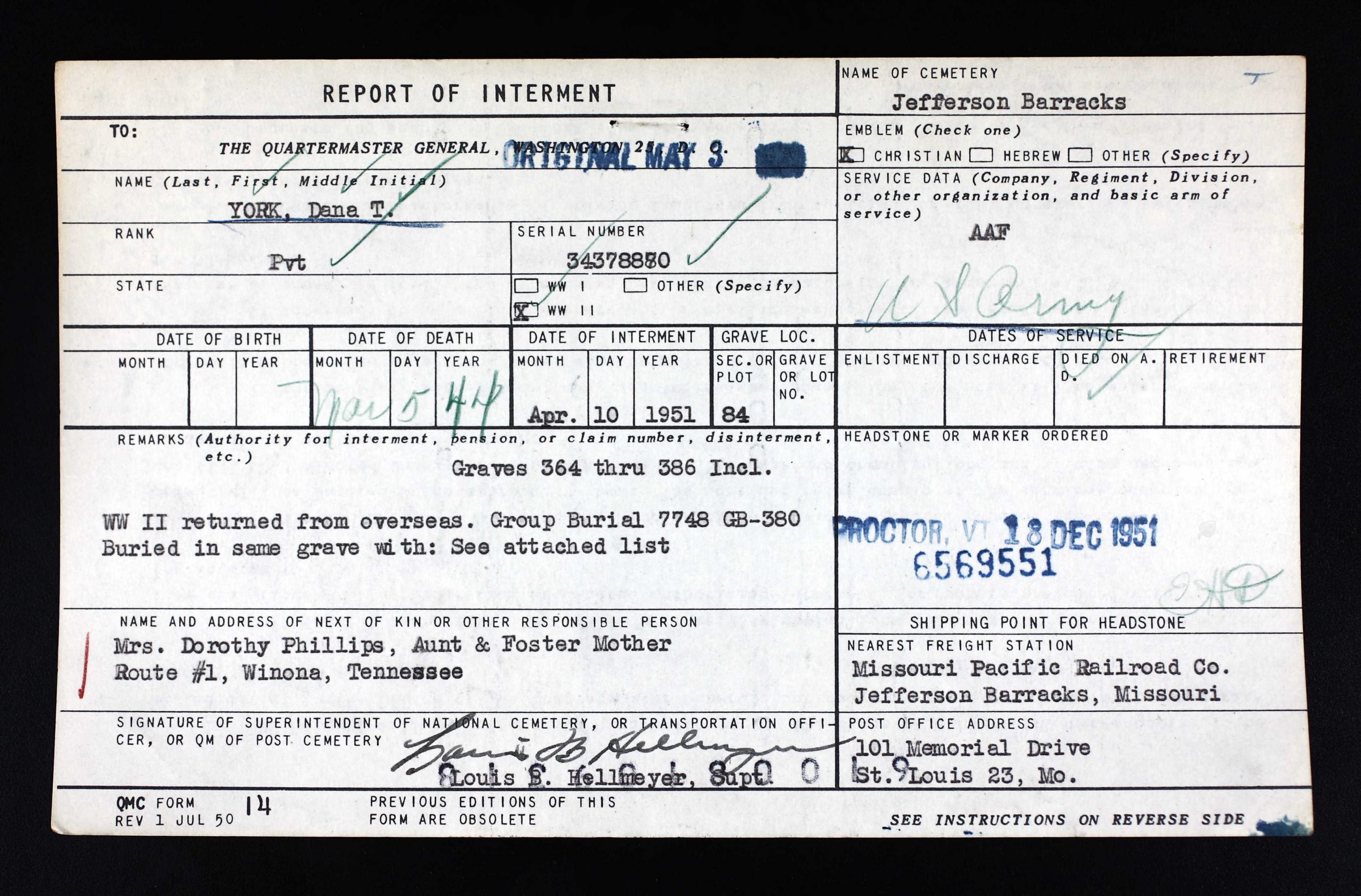 YORK, DANA T. The funeral of Dana T. York, formerly of Scott county and killed in the Pacific on March 5, 1944, will be held in St. Louis, Mo., April 10, interment in the National Cemetery. He was the son of the late Charlie York of this county. York was one of 39 unidentified soldiers killed and shipped back to the U. S. for burial. Services will be 1100 a.m. April 10. Those wishing to send flowers should send them in care of Supt. L. B. Hellmeyer, National Cemetery, Jefferson Barracks, St. Louis, Mo. Source The Scott County News, 6 Apr 1951, p1