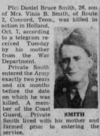 Pfc. Daniel Bruce Smith, 26, son of Mrs. Vinia B. Smith, of Route 2, Concord, Tenn., was killed in action in Holland Oct. 7, according to a telegram received Tuesday by his mother from the War Department. Private Smith entered the Army exactly two years and six months before the date on which he was killed. A member of the Coast Guard, Private Smith lived with his mother and farmed prior to entering the service. Additional survivors include two brothers, Riley and Perry Smith, both of Route 2, Concord and one sister, Mrs. Exie Campbell of Maryville.
