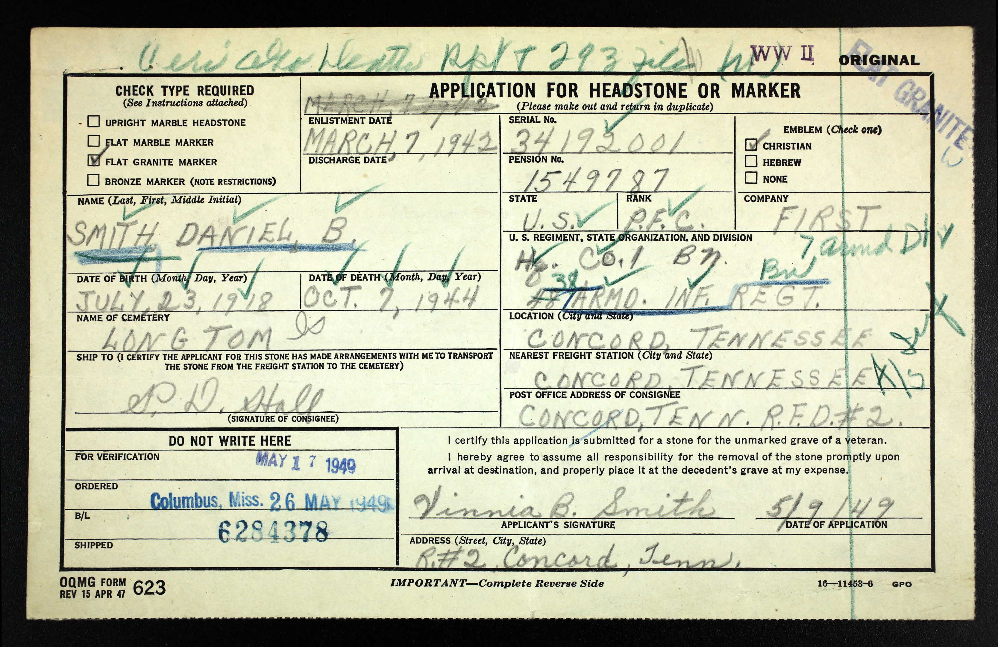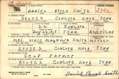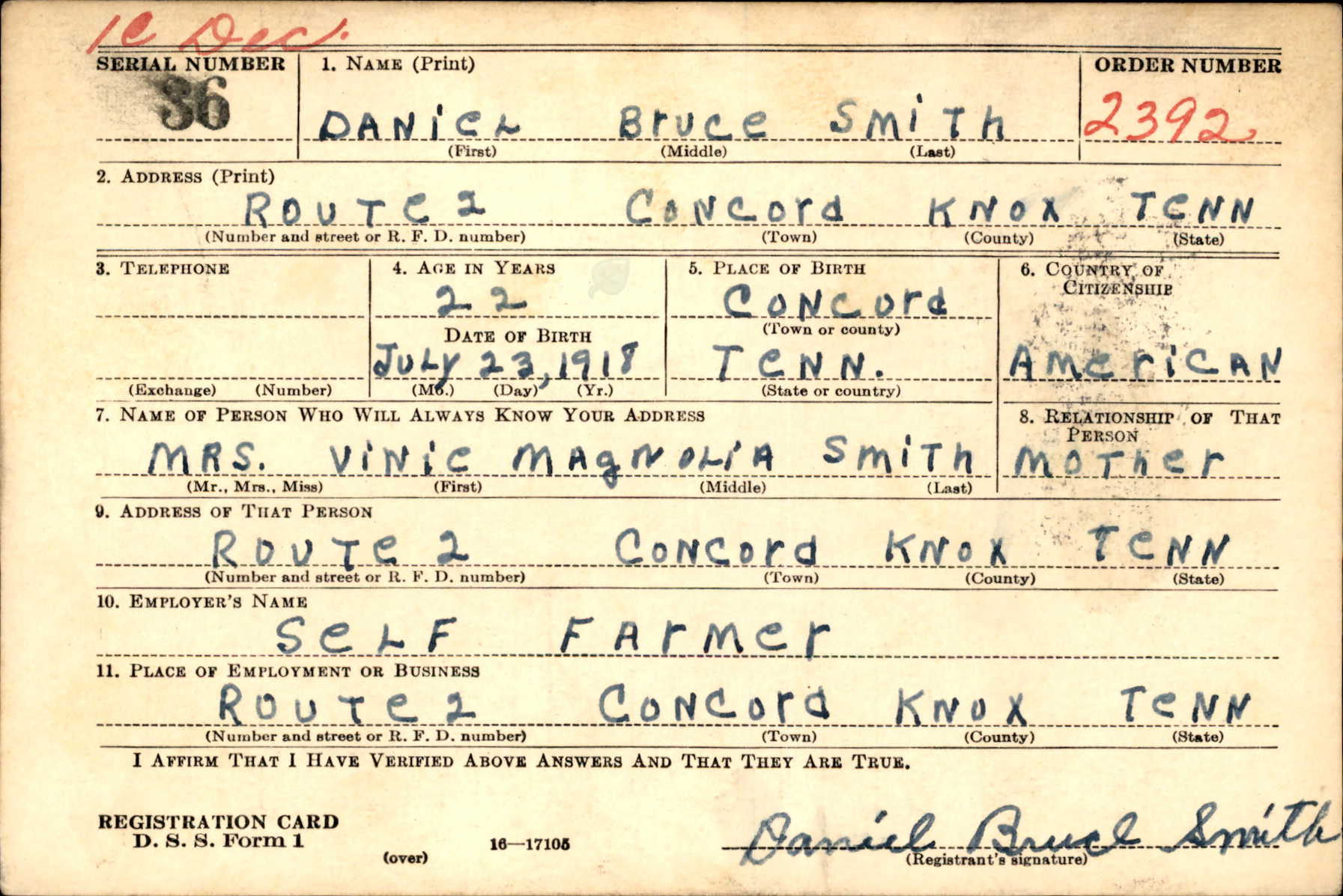Daniel Bruce Smith was born in Concord, Tennessee on 23 July 1918 to John Smith and Vinia Magnolia Brewer