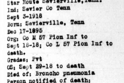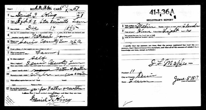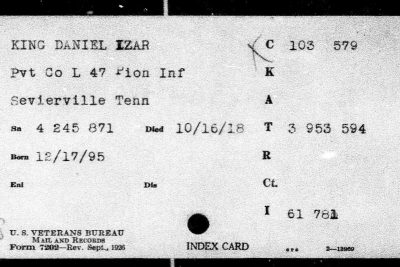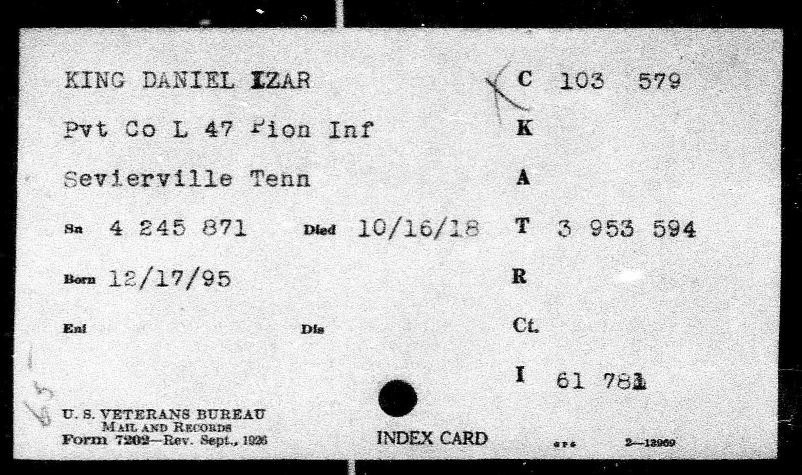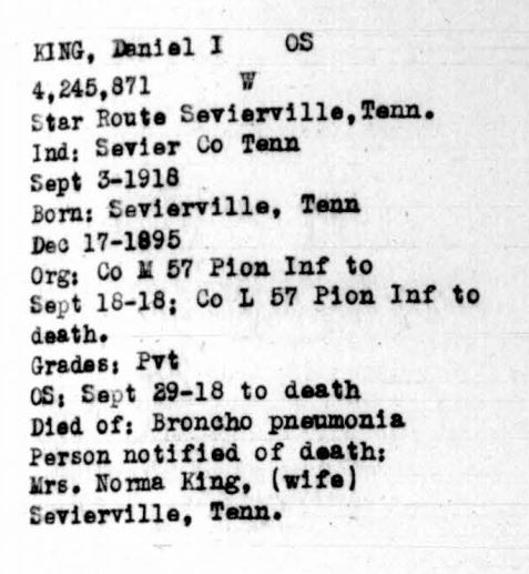 Daniel Isaish or Izara King was born 17 December 1895, Sevier County, Tennessee to Nathaniel Wiley King Jr. and Mary Elizabeth McCarter. He died 16 October 1918 of Broncho Pneumonia.