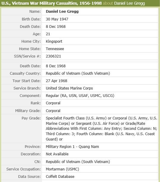Daniel Lee Gregg was the son of Mr. and Mrs. William C. Gregg. He was graduated from eight weeks of recruit training at the Marine Corps Recruit Depot and had complete four weeks of individual combat training at Camp le Jeune in North Carolina. His tour began on April 27, 1968.