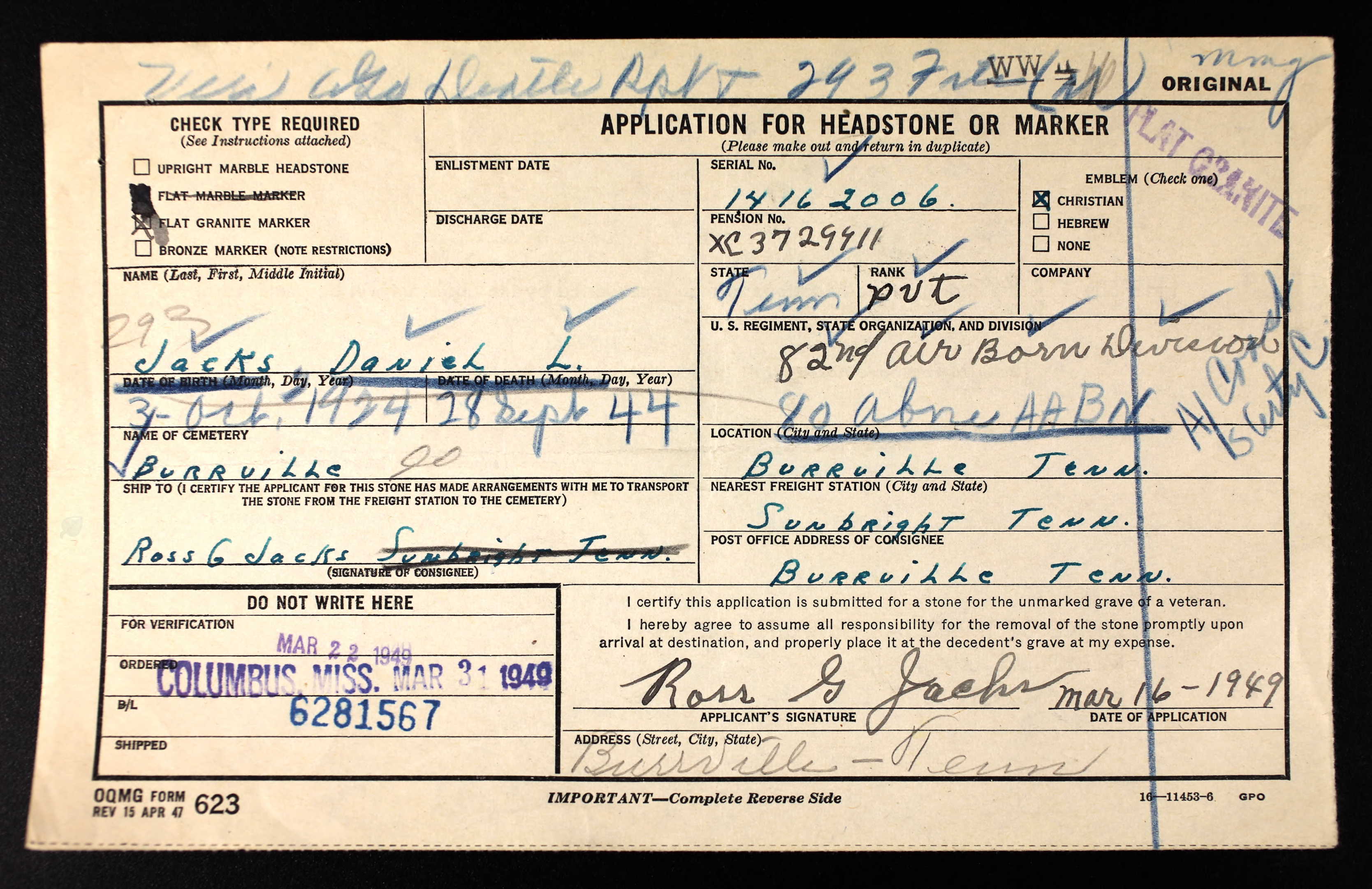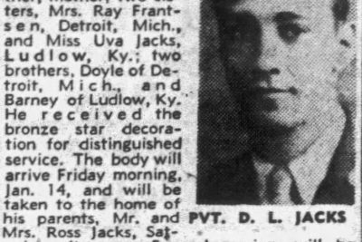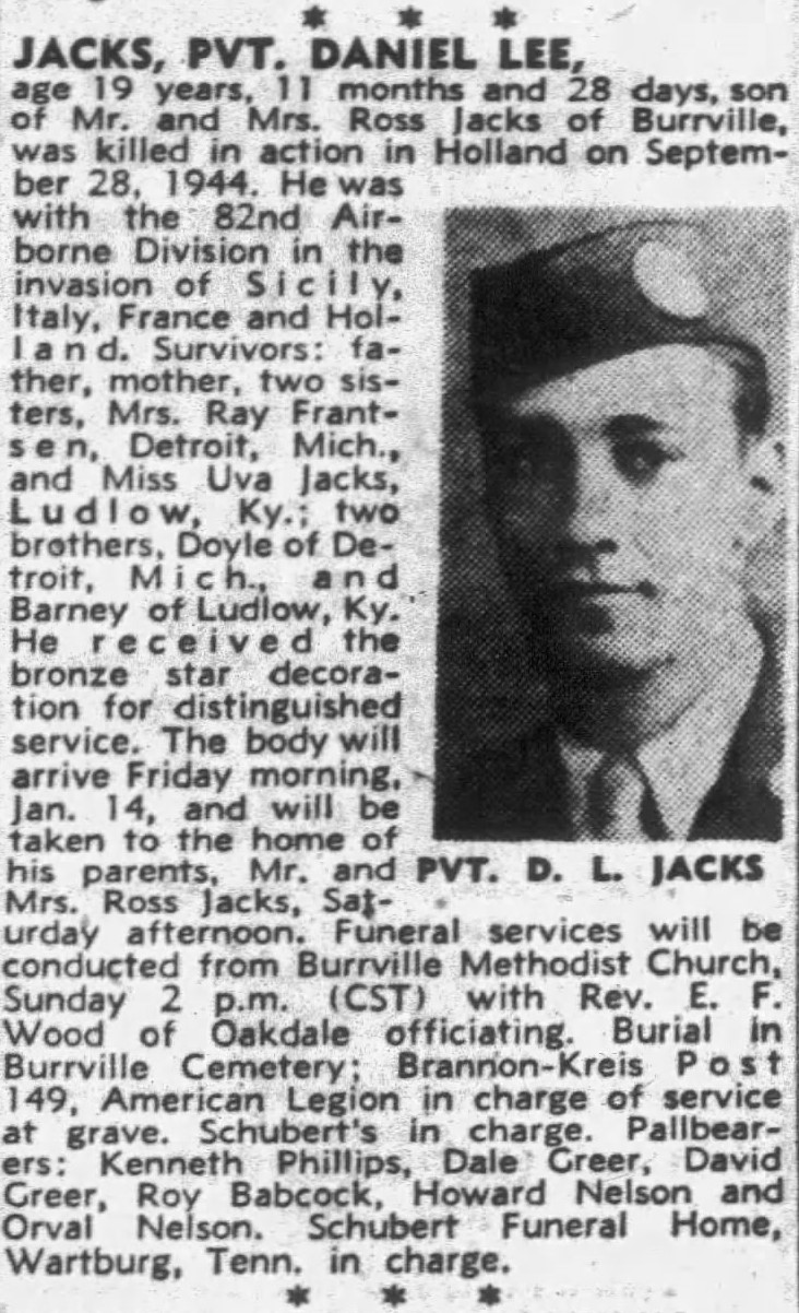 Pvt. Daniel Lee Jacks, age 19, 11 months and 28 days, son of Mr. and Mrs. Ross Jacks of Burrville, was killed in action in Holland on September 28, 1944. He was with the 82nd Airborne Division in the invasion of Sicily, Italy, France and Holland. Survivors: father, mothers, two sisters, Mrs. Ray Frantsen, Detroit, Mich., and Miss Uva Jacks, Ludlow, Ky.; two brothers, Doyle of Detroit, Mich, and Barney of Ludlow, Ky.
