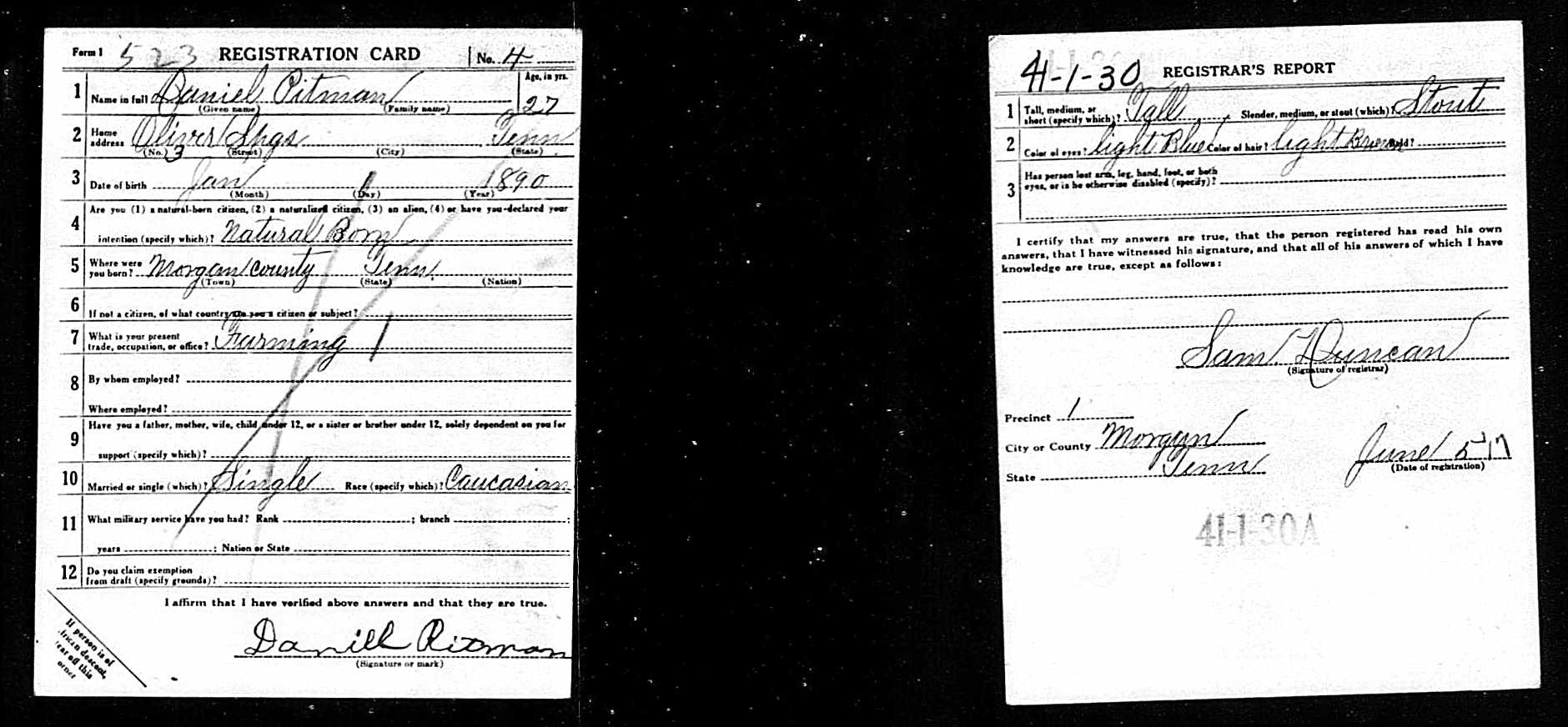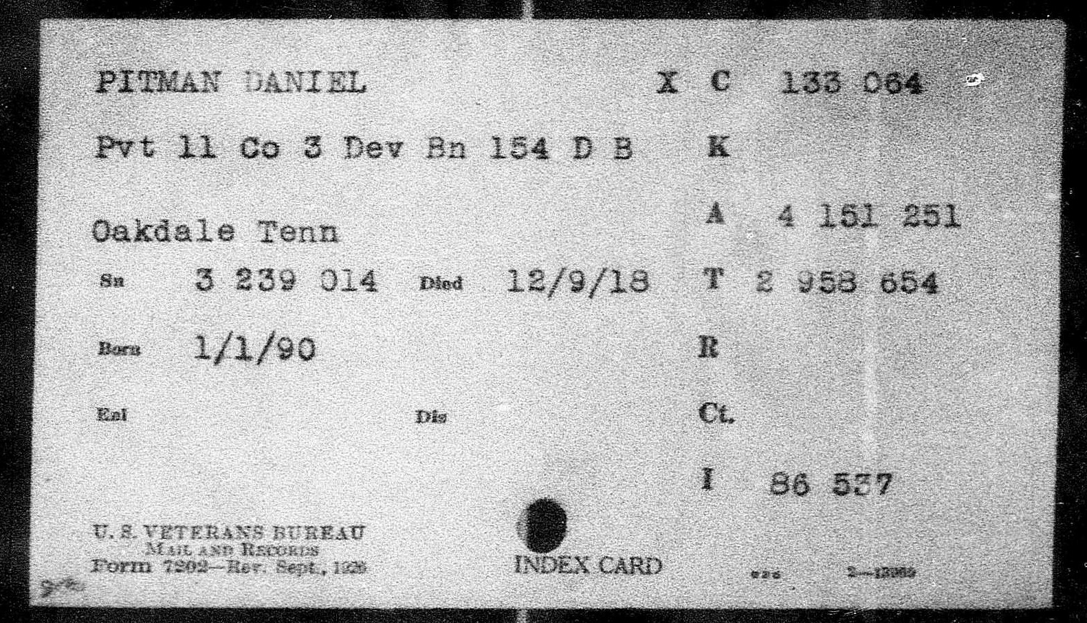 Daniel Pitman was the foster son of W.T. Langley. He was a farmer prior to his induction into military service on July 11, 1918 at Fort Thomas, Kentucky. He died at Camp Meade in Maryland. He is buried at Langley Cemetery, Morgan County, Tennessee.