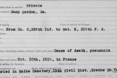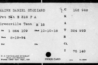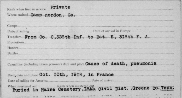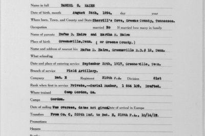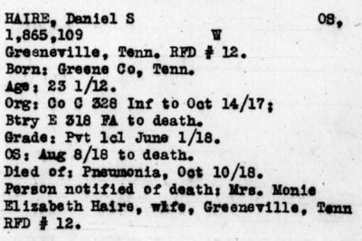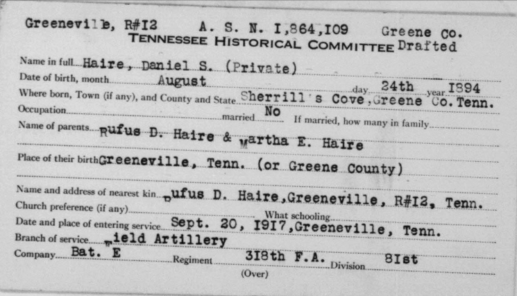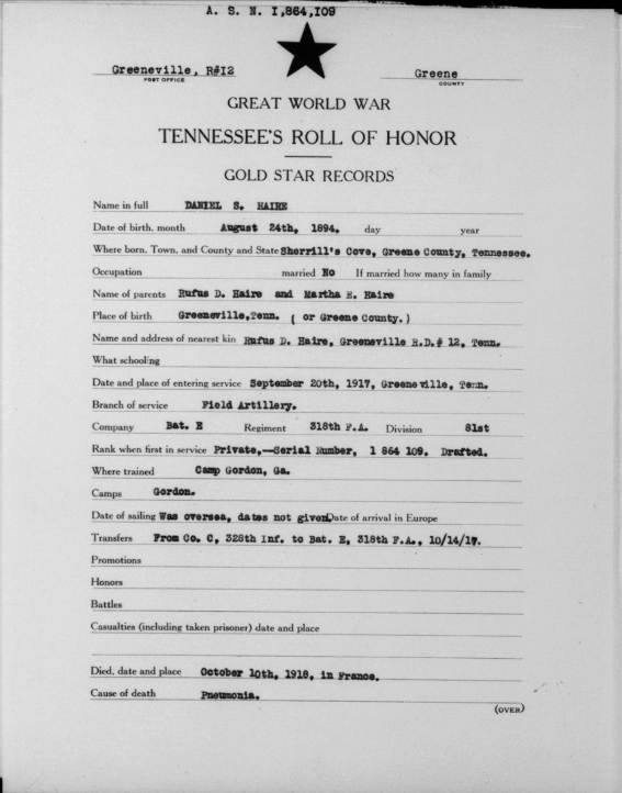 Daniel S. Haire was borne in Greene County, Tennessee to Rufus D. and Martha E. Haire. He was married to Nona Elizabeth Haire. He entered the service on 20 September 1917 at Greeneville and trained at Camp Gordon in Georgia. He died of pneumonia in France at the age of 23.