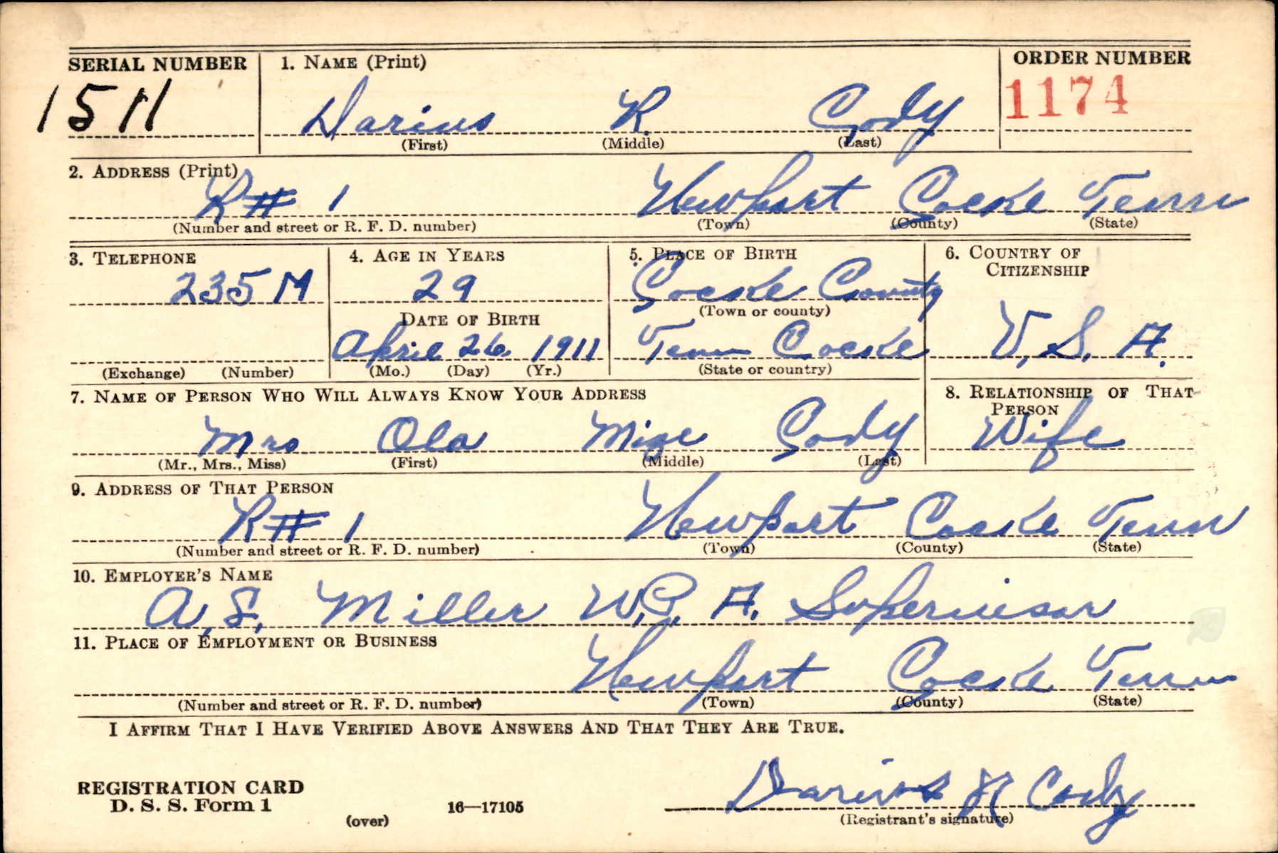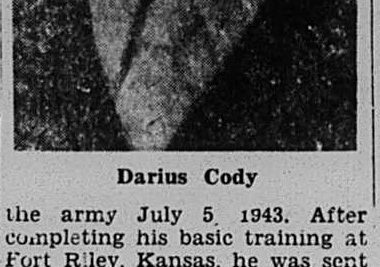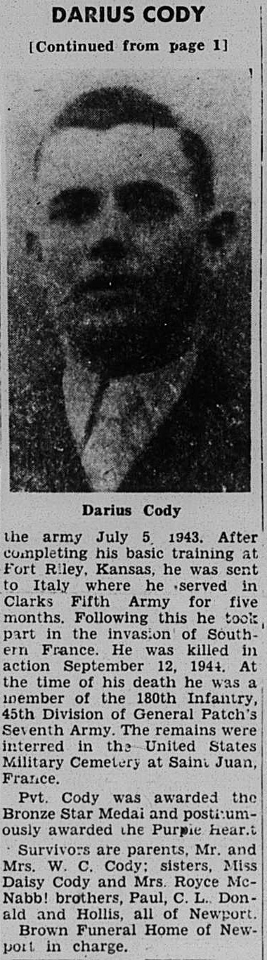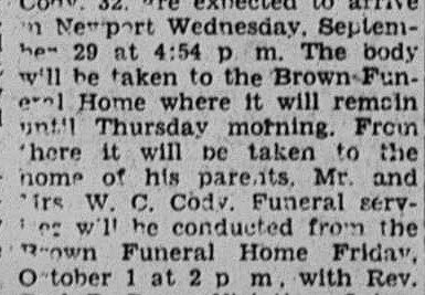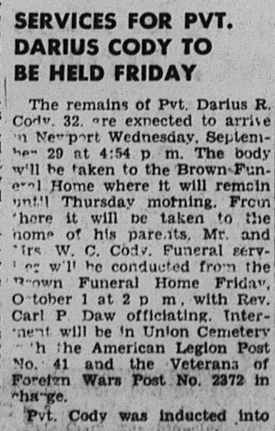 The remains of Pvt. Darius R. Cody, 32, are expected to arrive in Newport Wednesday , September 29 at 4:54 p.m. The body will be taken to the Brown Funeral Home where it will remain until Thursday morning. From there it will be taken to the home of his parents, Mr. and Mrs. W.C. Cody.