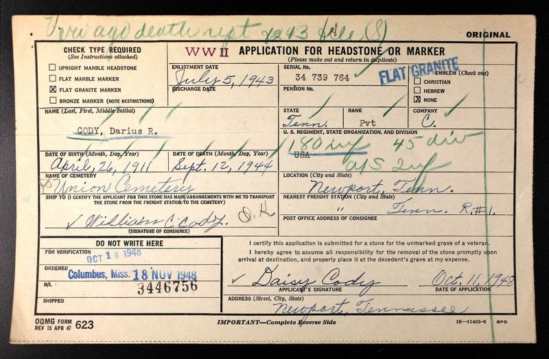 Pvt Cody was inducted into the army July 5, 1943. After completing his basic trianing at Fort Riley, Kansas, he was sent to Italy where he served in Clarks Fifth Army for five months. Following this he took part in the invastion of Southern France. He was killed in action September 12, 1944. At the time of his death he was a member of the 180th Infantry, 45th DIvision of General Patch’s Seventh Army. The remains were interred in the United States Military Cemetery at Saint Juan, France.